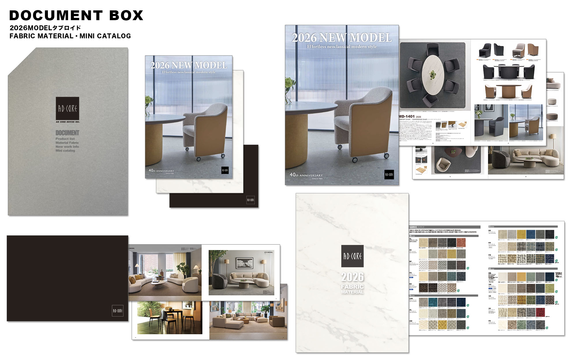 エーディコア・ディバイズでは、環境への取組みの一つとして総合カタログの印刷を廃止しました。マテリアル&ファブリック冊子、スタイルカタログ、2026モデル新製品のタブロイドなど簡易印刷については継続しています。それらの冊子を収めたBOXです。複数部数後必要な場合はその旨ご記入ください。