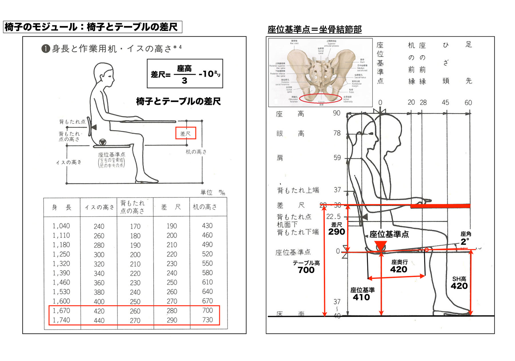 差尺の正式な算出方法は座高÷3-10ミリで、身長が170センチの方で座高が900ミリ÷3-10ミリ=290ミリが差尺となります。そして、その290ミリを座の高さにプラスするのですが、410ミリの座の高さに290ミリを足して700の高さになります。しかし、この座の高さの基準が問題なんです。一般的に販売されている椅子はSH400から輸入品のSH470くらいまでかなり高さに幅があり、同じメーカーでもデザインによってかなり高さの表記が違います。当社の椅子もSH410~SH450と40ミリも違います。それに合わせるテーブルの高さが40ミリ違うかといえば、そうではありません。座の高さの基準になるのが、座位基準点になります。これは座骨結節部(骨盤の下に突き出た部位)で人が座る時に身体を支える場所になり、この座位基準点の高さに差尺を足してテーブルの高さが決まるのです。