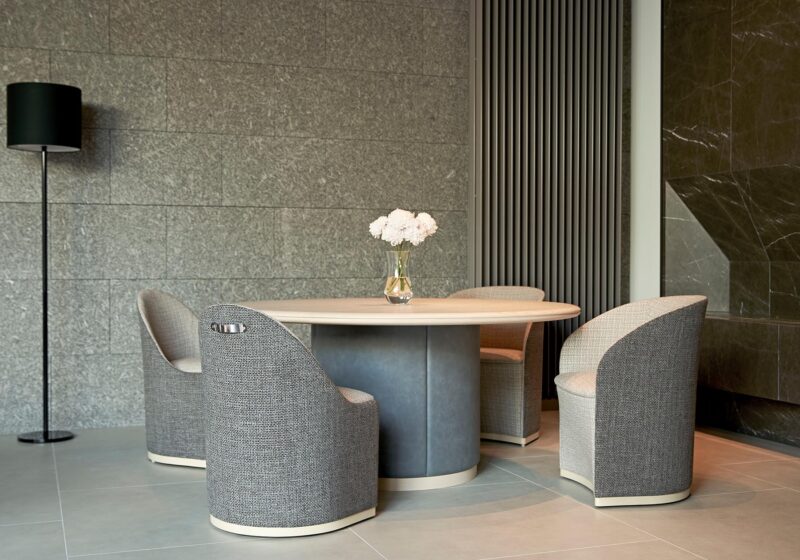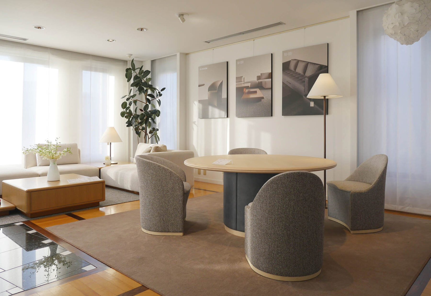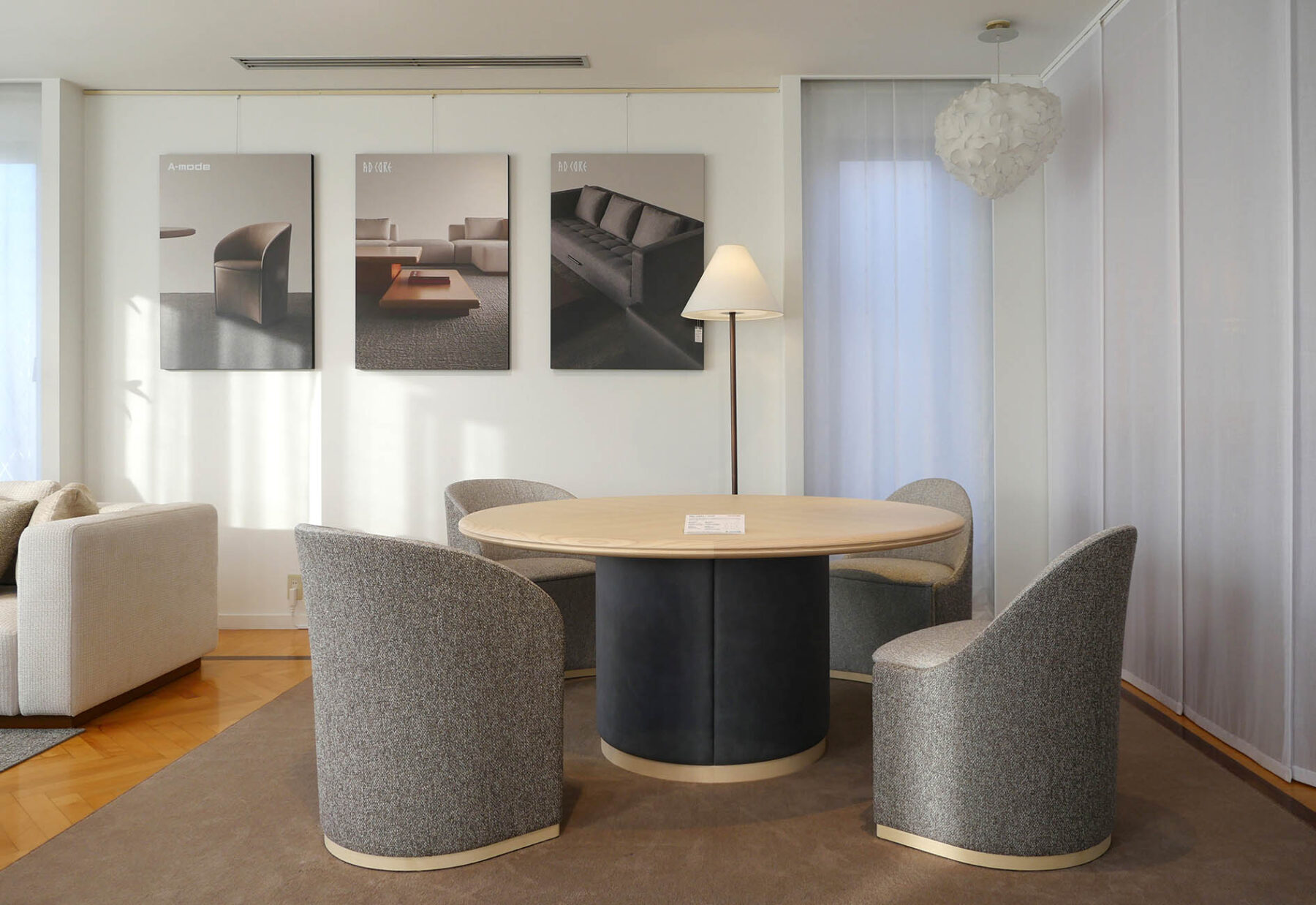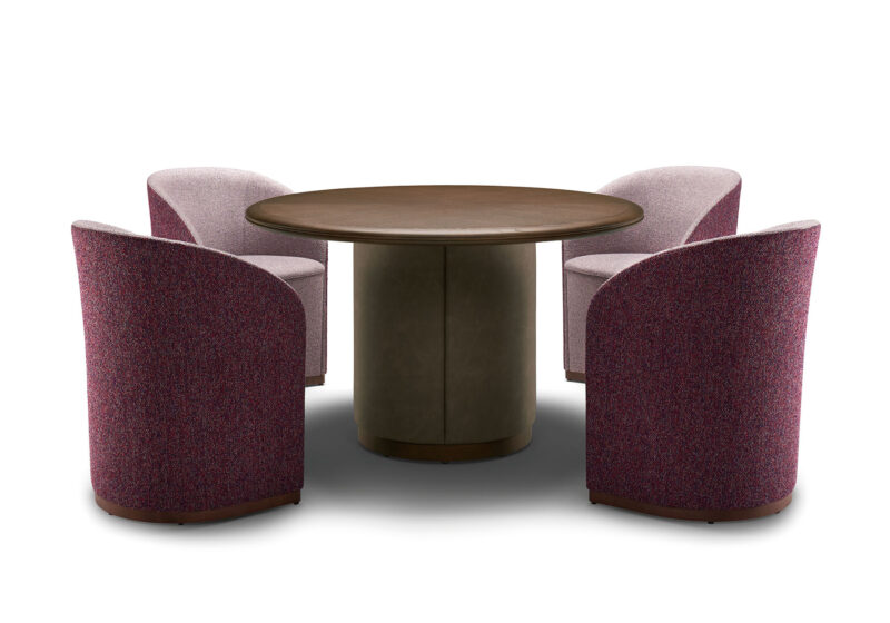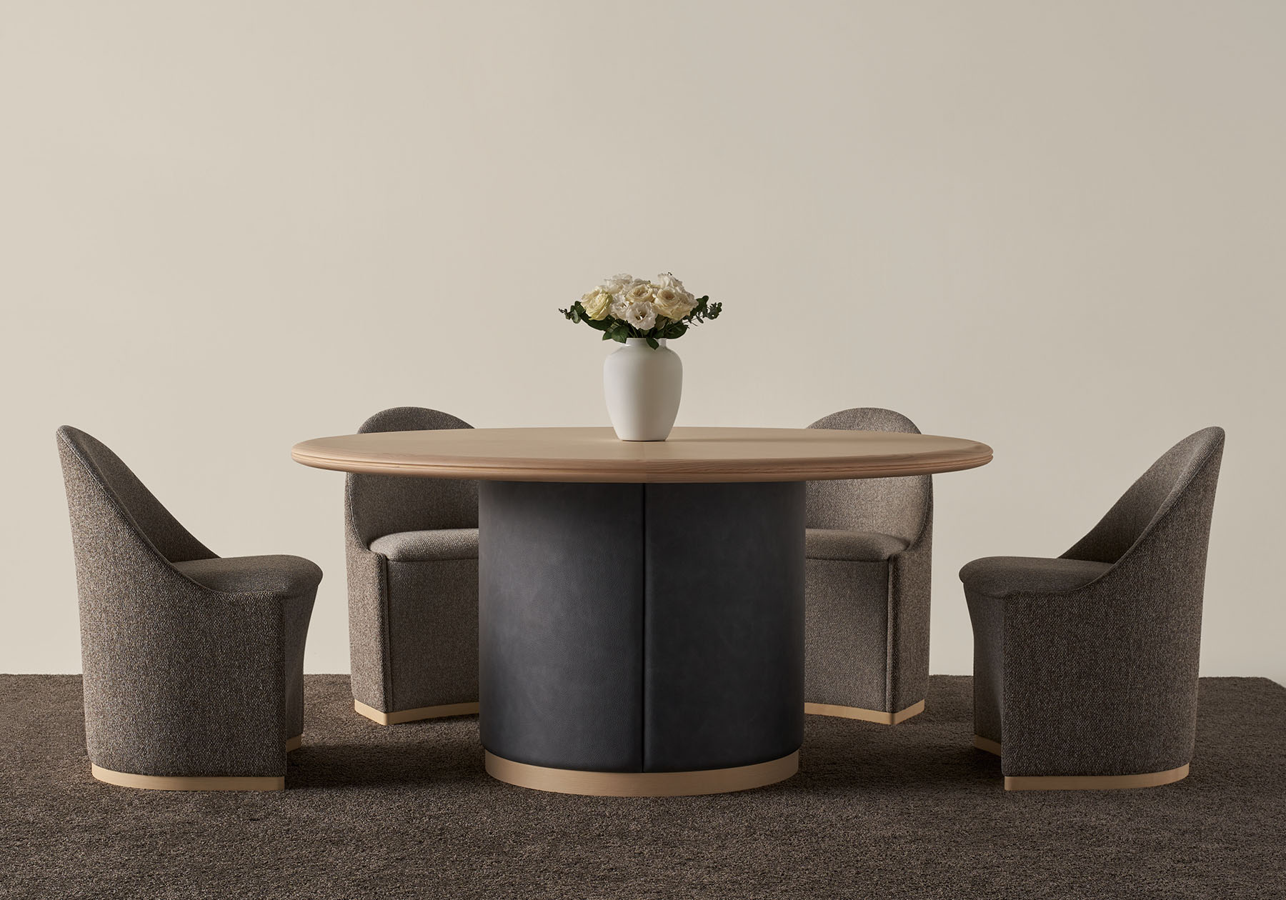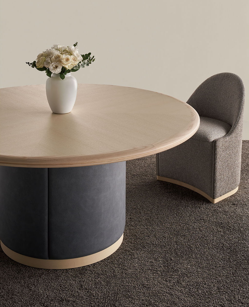 クッション材入りの脚部は脚当たりを柔らかにすると同時に、合わせるチェアとの一体感が生まれるようにファブリックにしました。脚先の木製台輪もインテリアのカラーに合わせコーディネート可能です。インテリアシーンに柔らかな印象を与えるラウンドテーブルはフォーマルなダイニングからオフィスのミーティングテーブルなど空間に色を与えます。