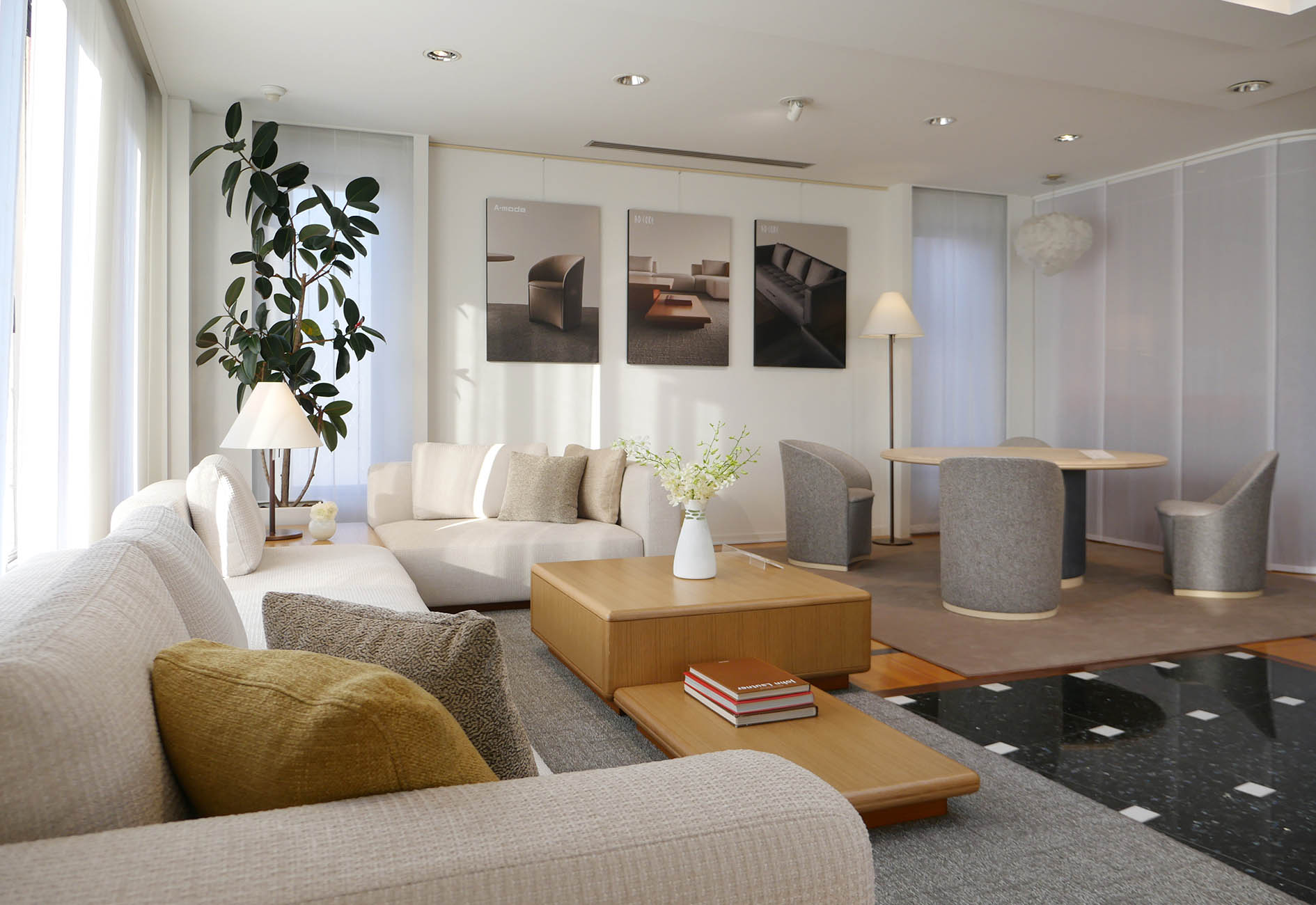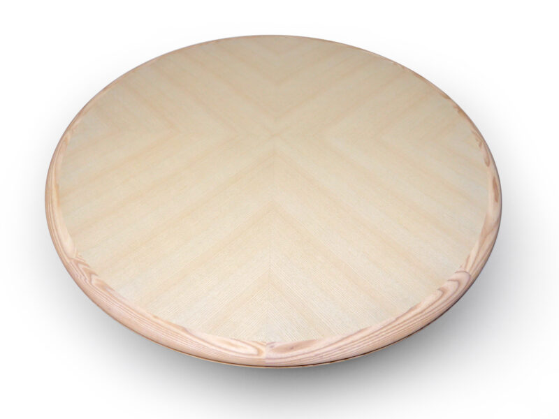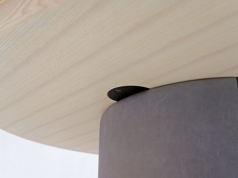 φ1200とφ1500の円形天板は小口にホワイトアッシュ材とトップにホワイトアッシュ突板を使用し裏まで仕上げています。脚部は堅牢な合板下地にウレタンフォームを使用しファブリックで仕上げました。住宅での足の指触りを優しくしオフォイスでの靴当たりも柔らかに受け止め、華やかなファブリックや防汚性能の高いレザーを選択することができます。脚先の木製の台輪はホワイトアッシュ材で作られ、清掃時の汚れや傷みからファブリックを守ります。