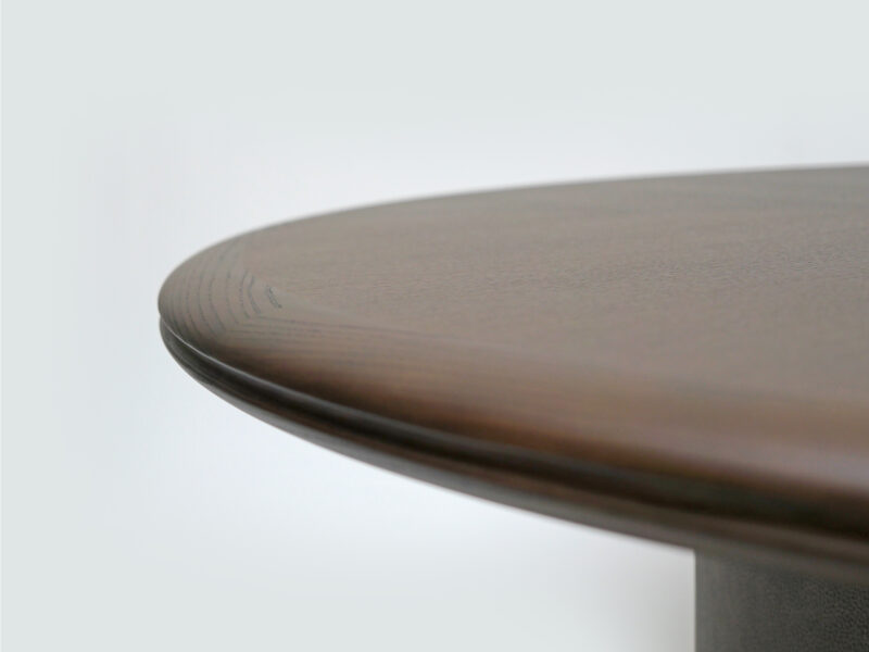 1970年代の自由で柔らかなリラックスした時代を感じられるようなネオセブンティーズデザインの柔らかな脚部とエレガントな天板のラウンドテーブル。天板の小口の形状は厚みを感じさせないグローブラインが入れられ、手の触感とテーブル上に置く物の滑り落ちを防ぐラインを人間工学的に設計し、矢羽張り分けのTOPはフォーマルな使い方での個人スペースを考慮しました。