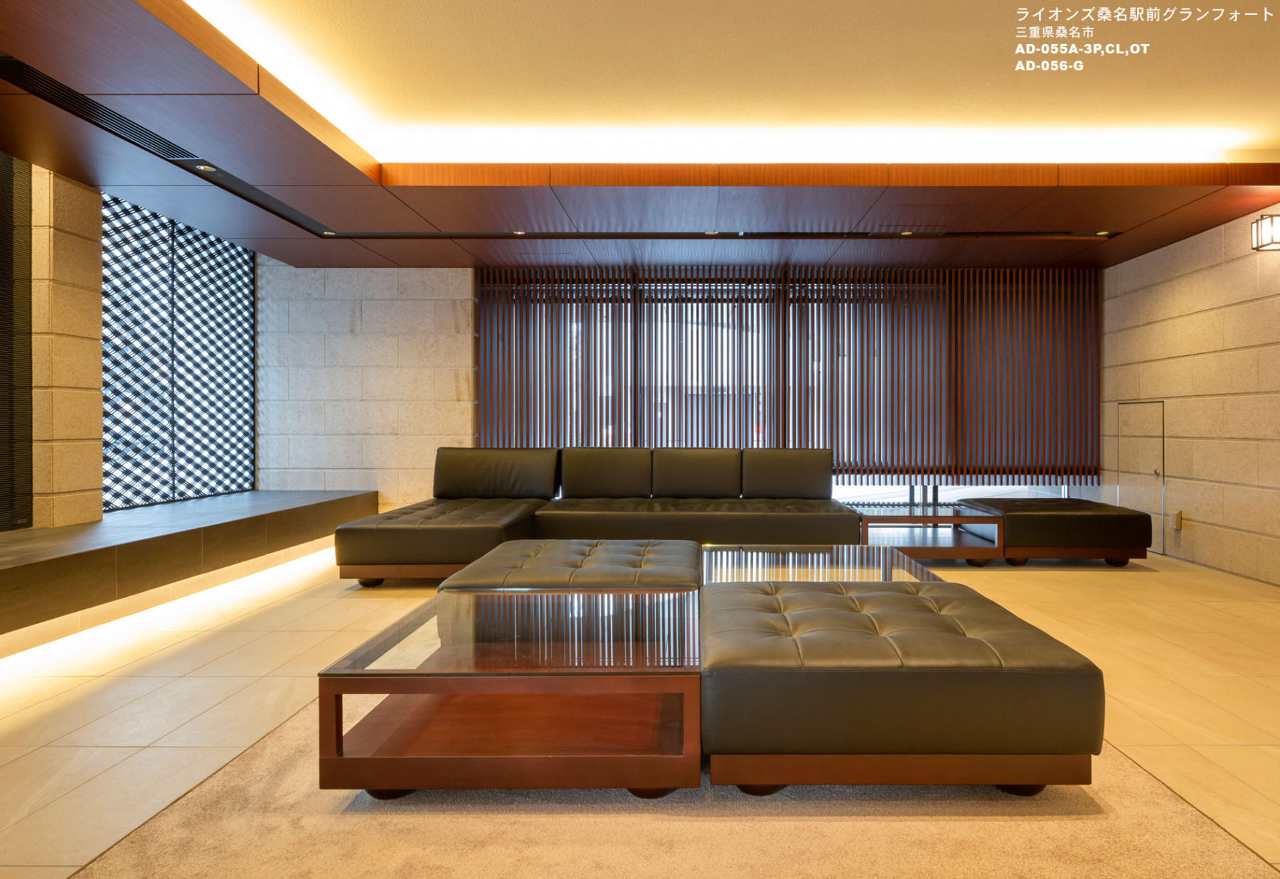 桑名駅前に建つ分譲マンション。石と木調で彩られたラウンジはレトロモダンな佇まいを想起させ、また重心が低い家具をセレクトすることで空間の品格を高めます。