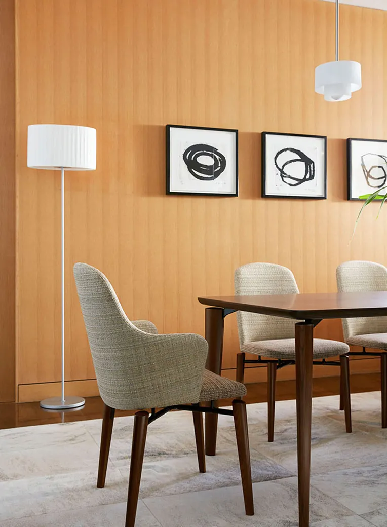 金属と成型合板、ソリッドウッドと3次元成型など、斬新な異素材の組み合わせが、