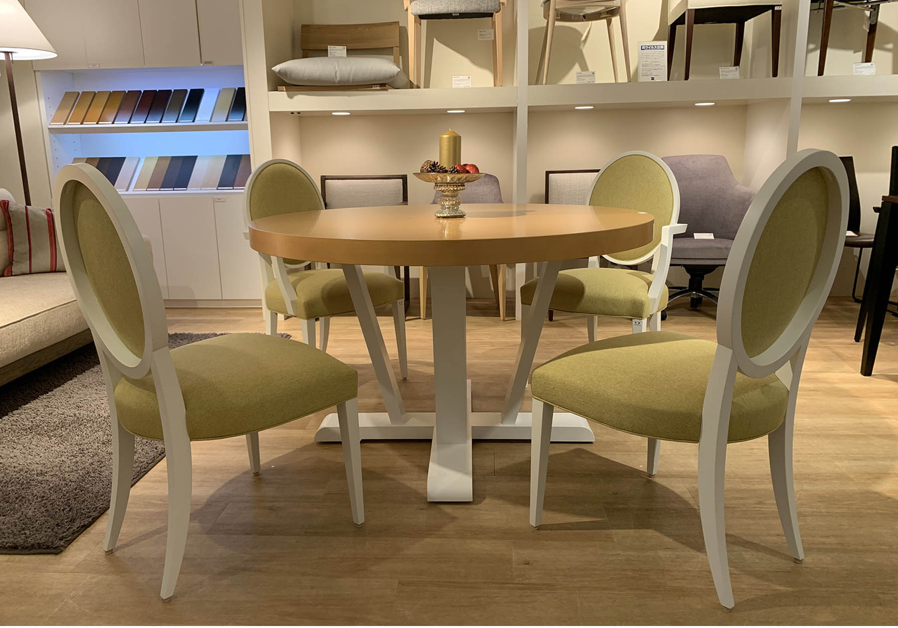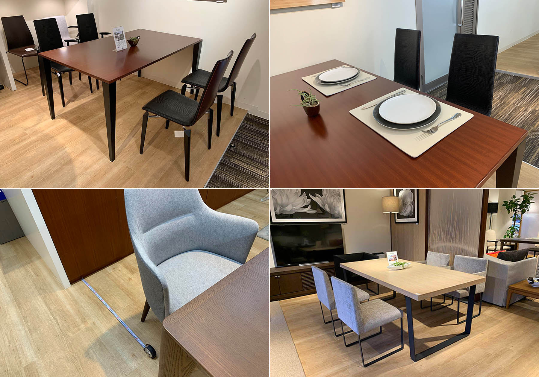 まずは、お部屋の広さと使用する人数でサイズを選びレイアウトを考えます。一般的に一人に必要なスペースは幅60~70cm、奥行きは40~50cmと言われています。1~2人用であれば90cm×90cm、4人用は150cm×90cmのサイズでゆったりお使いいただけます。名古屋・栄ショールームに展示をしているダイニングテーブルのSOTTILEは、150cm×90cmですので実際にお座りいただいてサイズ感をお試しいただけます。6人用は180cm×90cm、210cm×100cm、8人用では240cm×100cm以上のものが目安となります。W180cmのダイニングテーブルでも、四隅に脚を取り付けているものや、内側に入った位置に脚があるタイプなど、天板サイズが同じでもチェアを置く有効寸法はデザインにより異なります。脚間の有効寸法によりアームチェアとサイドチェア、スツールの組み合わせなどで変わりますので、ショールームの展示品を確認しながら生活スタイルに合わせてお選びください。また、奥行が90cm以上のダイニングテーブルは、中心にゆとりがありますのでお花やディスプレイを飾るなど、テーブルウェアを楽しむこともできます。来客が多かったり、食事以外にもお仕事や学習机替わりに使用する場合は、そのスペースも考慮したサイズ選びが必要です。快適にお使いいただくには目的に合ったサイズ選びが欠かせません。また、動線の確保も重要なポイントです。椅子を引くスペース70〜80cmや人が通るスペース60〜90cmは確保してください。ショールーム展示も動線を考慮してレイアウトしています。また、円形のテーブルも人気ですが、椅子が四方に出るため長方形のテーブルに比べて専有面積が広いので、スペースが充分に確保出来ない場合は長方形がおすすめです。テーブルのサイズや形状は、ご使用される人数や配置と合わせて必要な動線が取れるかも重要なポイントになります。ショールームでもダイニングセットの展示と合わせて、ご相談を承りますので図面をお持ちいただきお気軽にご相談ください。