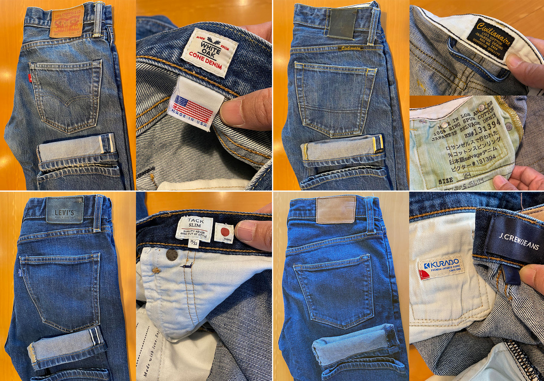 海外に行くと1本はジーンズを買っていましたが、この2年は海外出張が無かったので、新しく購入するために久しぶりにデニム屋さんに行きました。オーソドックスなジーンズが好きなのでストレートを選ぼうとすると、同じモデルでもいろいろあり悩みます。あるメーカーでは、価格カテゴリーで通常版とプレミアム版があり、製品の製造国では、東南アジア製、日本製、アメリカ製。プレミアム版の中でも東南アジア製がある、、。使用されるデニム生地はジーンズの裏の外側に赤耳と言われる、幅が80センチのデニム布を使ったセルビッチというタイプと、通常の幅広のデニム布を使用したタイプがあります。そのデニム布は日本製が最上位品になっています。ジーンズの価格順としては東南アジア製→日本製→アメリカ製(布製造国不明)→アメリカ製(日本製布)とUPしていきます。