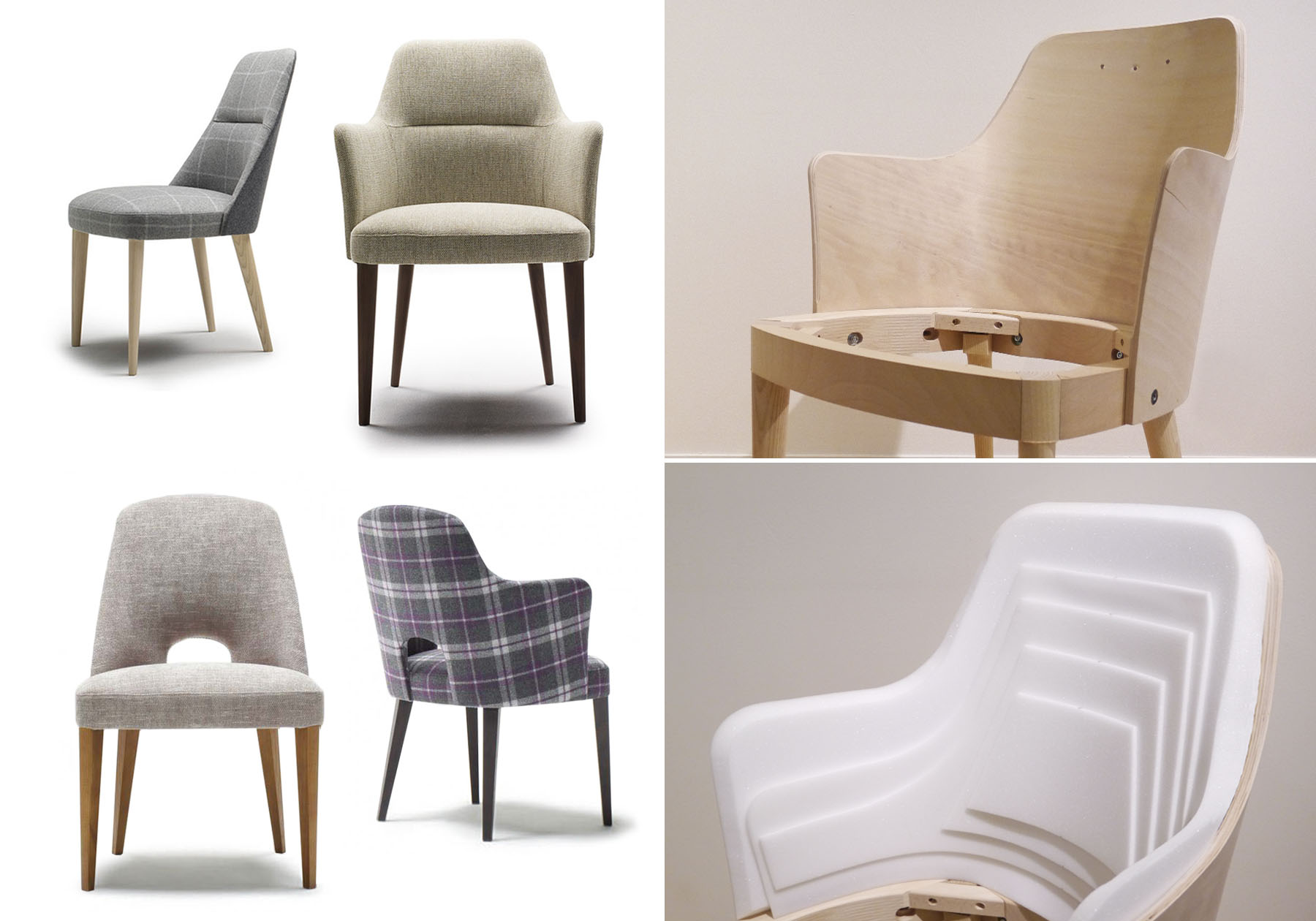 ピアノの製作には木材が重要な要素で、音の良し悪しが決まってしまうといっても過言ではありません。乾燥や湿度管理を慎重に行い、材料を吟味します。ピアノに使用される木材には、「スプルース」「カエデ」「ビーチ」などがありますが、本体の構造を支える側板(リム)や鍵盤蓋に使われているのが「ビーチ」材です。ビーチ材はコストパフォーマンスに優れ、強度や耐久性のある木材ですが、成型合板の材料として多用され、椅子を始め家具の材料としてもたくさん使われています。単板と呼ばれる1~2ミリ程度の厚みにスライスしたビーチ材を、何枚も重ねて「型」にセットして高周波を流して指定の形にします。ピアノ本体の流麗な即板や、鍵盤蓋の曲面はビーチ材の特性を活かし、成型合板技術で作られています。家具でも無垢材では得られない形状と強度を保つため、この技術を活かした製品があり、エーディコア・ディバイズの製品では、人気の高いMD-901やMD-501などの、椅子のアームから背を形つくるシェルに活かされています。成型合板にウレタンなどのクッション材を貼り、ファブリックをかぶせてしまうので表面には見えないのですが椅子の主役となるパーツになります。