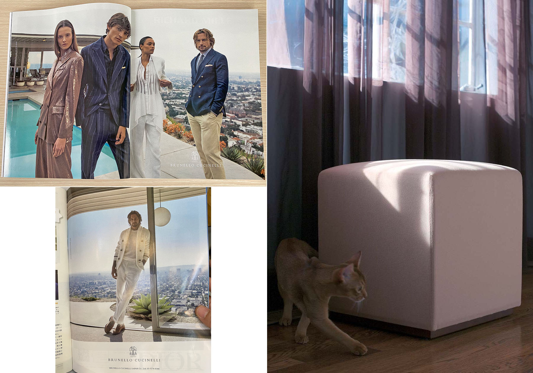 そのブルネロ・クリチネリの広告で使用されていたのが、ロサンゼルスのハリウッドの崖上にピエール・コーニッグが1958年に設計し建てたケーススタディハウスNo22のスタール邸です。ここにはアメリカ西海岸で撮影をスタートする2006年に最初にロケハンした住宅で、その後、当社のツアーでは何度も訪れている場所なので、すぐに分かりました。ファッションテイストはアメリカン・トラディショナル。撮影場所からもアメリカがターゲットなのは理解できます。新型コロナ感染でスペイン風邪以上の死者数を出したアメリカではいち早く経済活動をスタートさせました。好調なアメリカを販売先のターゲットとした販売戦略なのでしょうか、、。スタール邸は何度もファッションブランドの広告に使われ、今でも世界で一番有名な住宅として知られています。久しぶりに見た広告写真にスタール邸が使われていて懐かしく思いました。