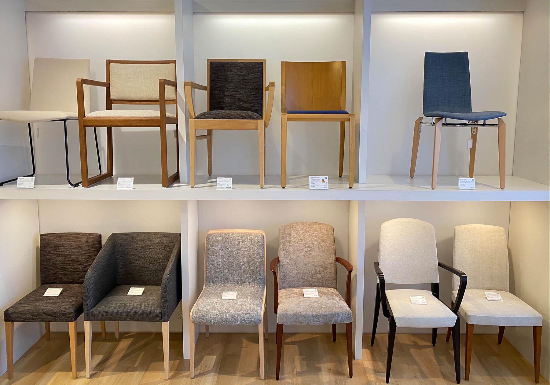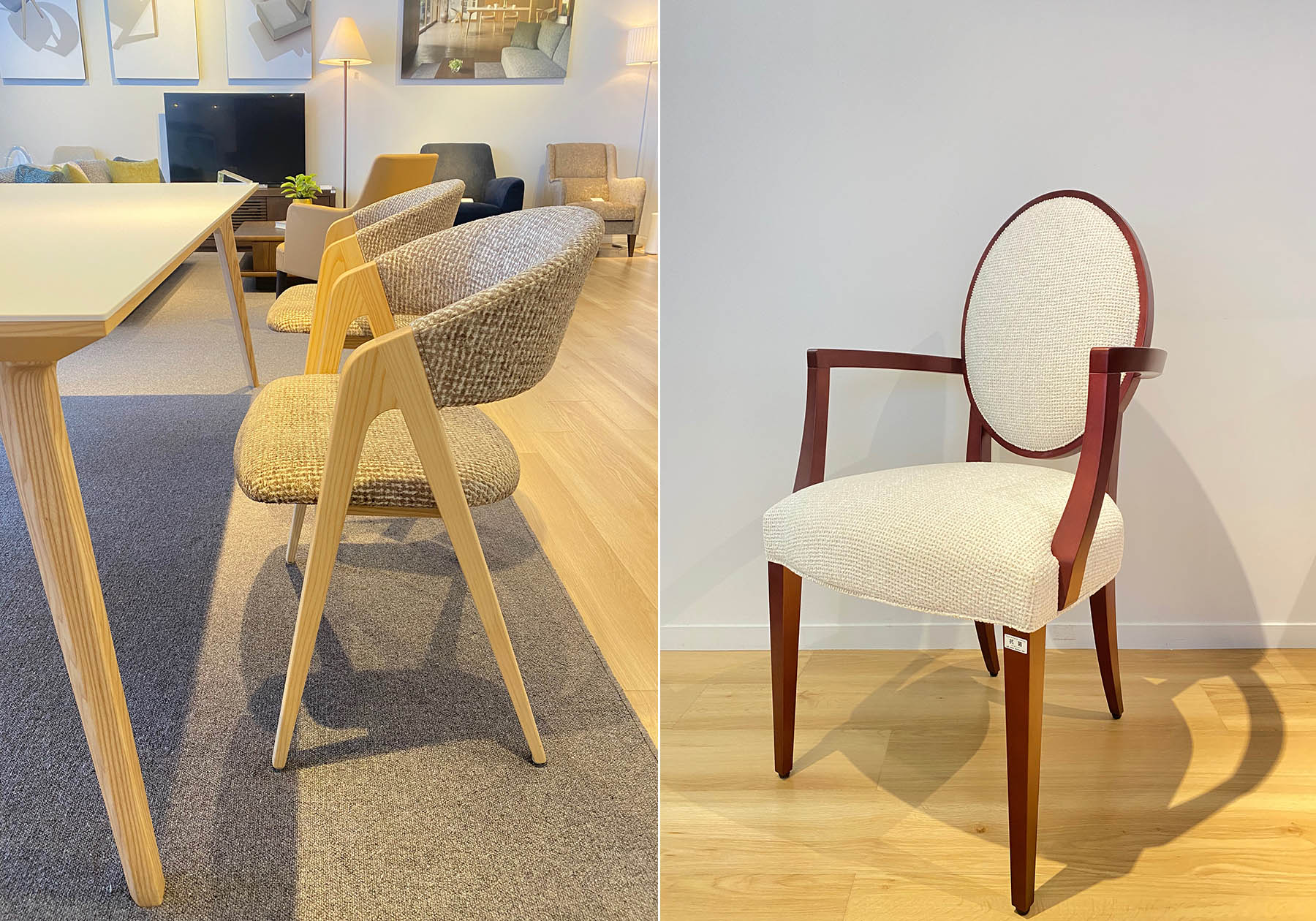 ショールームでは、まずどのようなシーンでお使いになるのかをお伺いし、お部屋全体のイメージと合わせながら、張地や木部色を実際に商品と合わせてご検討頂きます。座面の高さ等もご確認頂き、お客様に合わせた高さにあわせることも対応しています。また、カタログの張地以外もご提案させて頂きますので、ご希望がございましたらお気軽にご相談下さい。