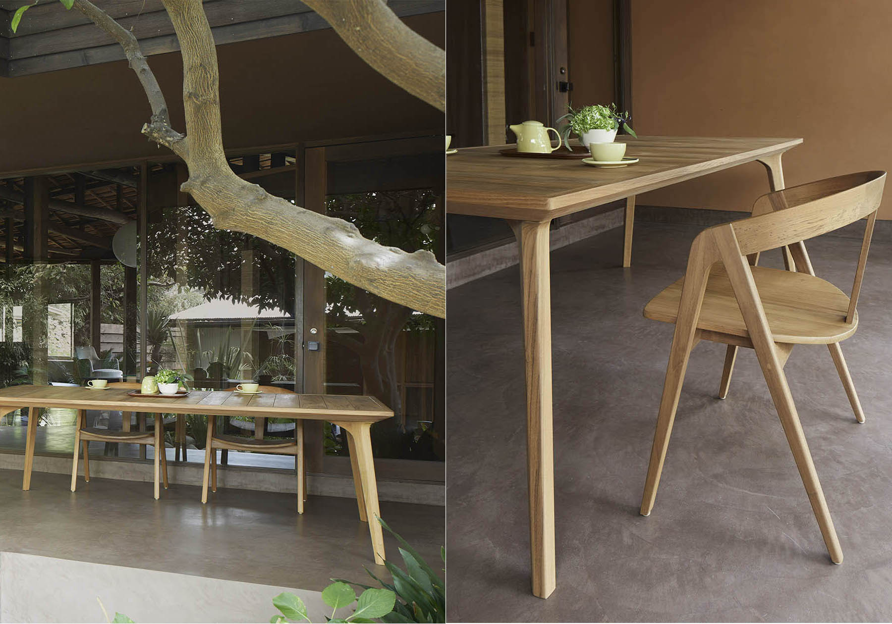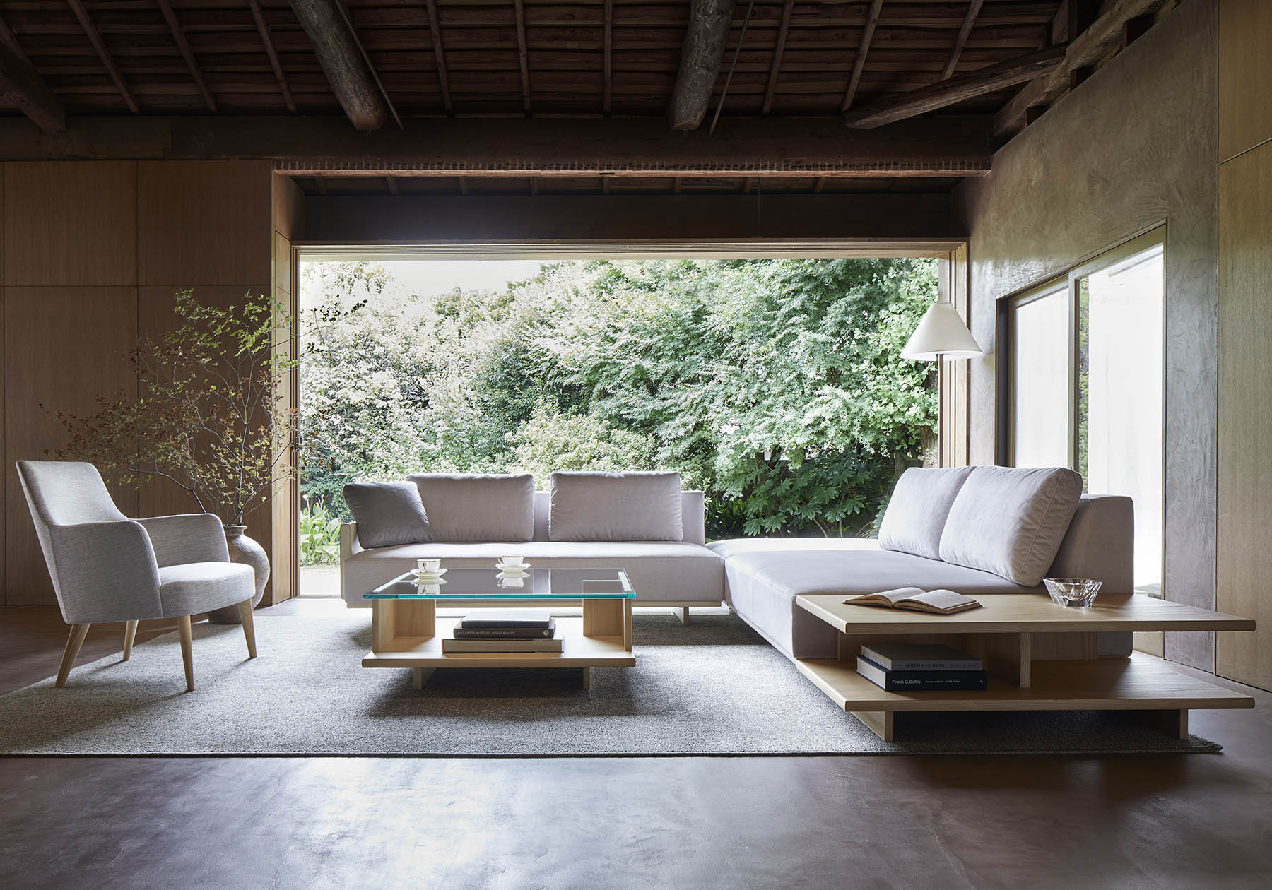 別荘やセカンドハウスの家具をお選びのお客様は、インテリアのご要望も日常の住まいとは異なります。特にリゾートを意識したコーディネートでは、外の景色も楽しめるように、ソファを窓向きに配置することが多くなります。目の前に広がる樹々や海、空を眺めていると自然とリラックスした時間を過ごせ、より非日常感を味わえます。一般的にソファはテレビが見えるように配置することが多いですが、日常生活でもソファの向きを変えるだけで違った雰囲気が味わえると思います。ご家族や親しい方と過ごすリビングのソファで人気の製品が、システムソファMD-1105シリーズです。シート幅のサイズバリエーションが多く、奥行きもD900mmとD1100㎜の2種類からお選びいただけます。コンパクトなシェーズロングとしてもお使いいただけるD1100㎜のタイプは、ソファの上でゆったりと過ごすことができるサイズ感でお客様から好評をいただいています。オットマンやベンチと組み合わせて抜け感のあるコンビネーションもできますので、ロケーションや使い方に合わせてお楽しみいただけます。また、テラスや広いバルコニーには、アウトスペースでもお使いいただけるテーブルとチェアをセットすると屋外での食事やティータイムも楽しめますね。