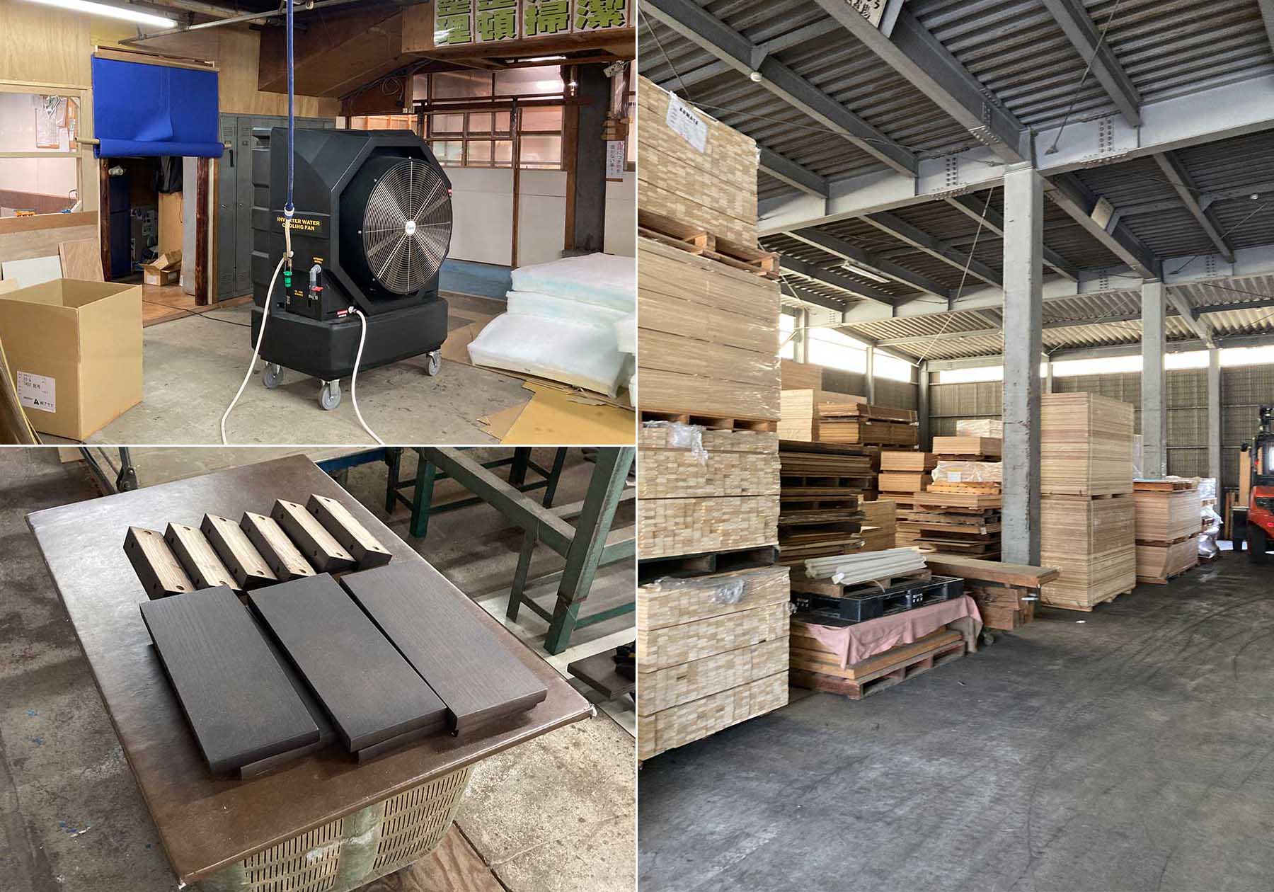今回訪問した日田市は、国内屈指の暑さが厳しい地区で、夏の訪問時にはいつもめまいがするような暑さの中、工場を廻っていました。今回お伺いする際も、工場の方からは「暑いですよ」と忠告されていたのですが・・・、お伺いした工場では以前感じたような厳しい暑さはありませんでした。それぞれの工場で活躍していたのが、水の気化熱によって冷風を送り出す移動式水冷扇。扇風機や換気扇とは異なり、外気を取り入れながら工場内の温度を下げる効果は抜群の機器です。消費電力も抑えられ広い空間で効果を発揮します。この機器は、当社でスチールパーツをお願いしている株式会社フナボリさんの製品なのですが、工場へ紹介して設置、暑さ厳しい日田の工場で環境改善に役立っていました。とは言うものの、やはり工場内はじっとしていても汗が滴る暑さ。でもこんな感覚を味わうのも3年振り、直接お伺いができるようになったからこその体験でした。