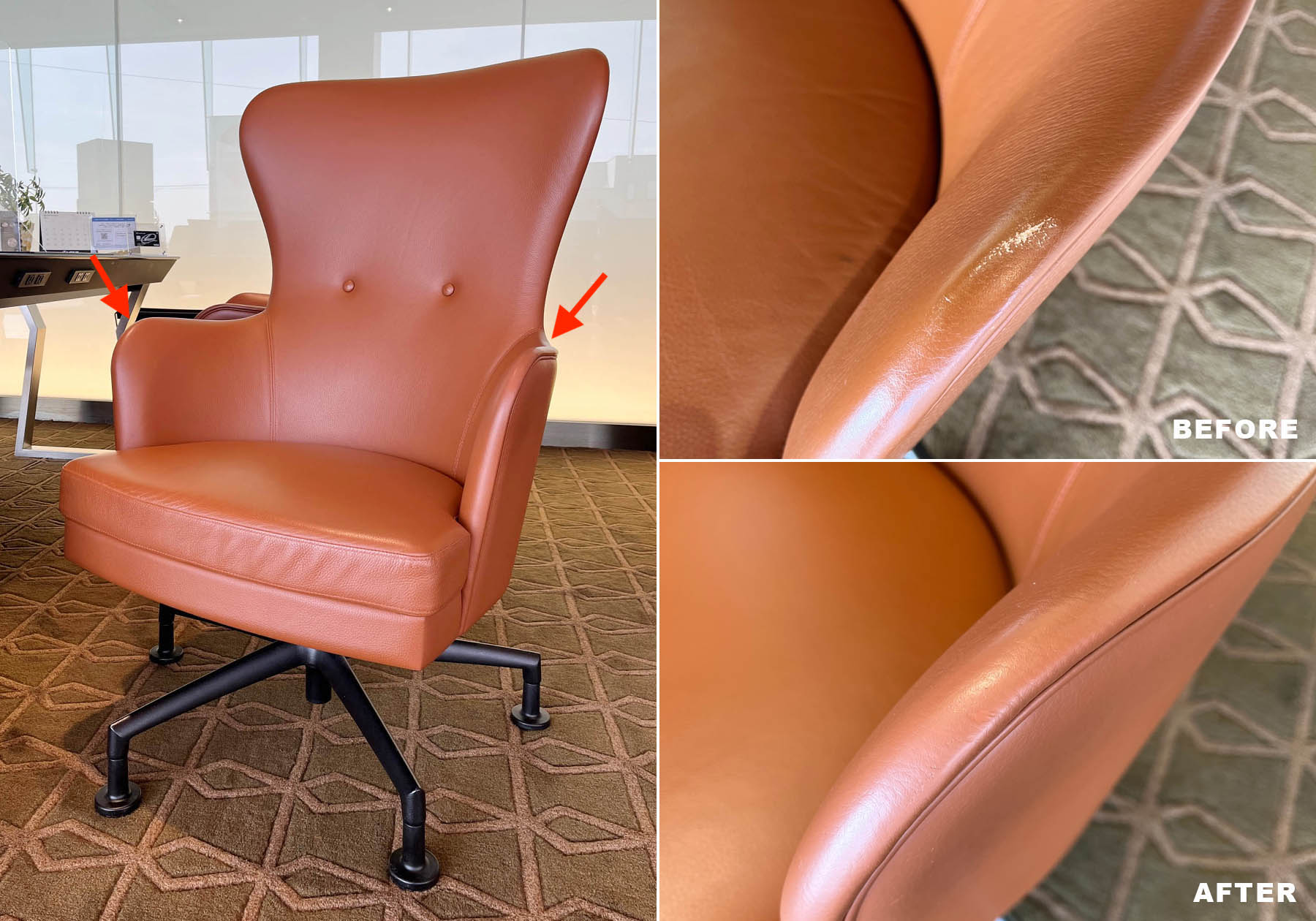 もう一点メンテナンスのお問い合わせで多いのが、天然皮革のキズや傷みについてです。天然皮革は鞣しや仕上げにもよりますが、椅子張り用のファブリックや人工皮革と比べても耐久性が非常に優れています。その分コストも上がってしまうのですが、天然皮革張りのソファは10年以上お使いになっても品質をしっかりキープしている例も珍しくありません。そんな耐久性のある天然皮革なので、一部分だけに傷がついたり、局所的に劣化が生じた場合、他の部分は全く問題がないのに張り替えてしまうメンテナンスを躊躇してしまう場合があります。本来であれば、全体を張り替えるメンテナンスがベストですが、軽度な症状の場合、費用的なご要望に合わせて、部分的な補修も可能な場合があります。傷んだ傷をウレタン樹脂などで補填、表面を研磨仕上げを施し、革の色に合わせて塗装補色するとても繊細なメンテナンス作業ですが、通常のご使用には問題ないレベルまで補修が可能な場合があります。お使いになっている革、痛んだ症状に合わせて対応を検討させていただきますので、お悩みの場合は是非ご相談ください。