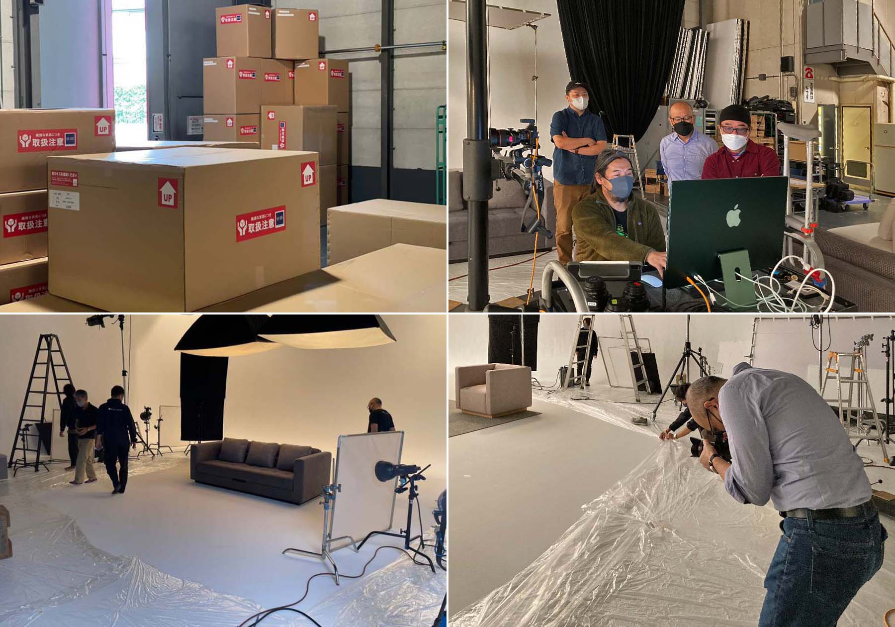 今年の新製品は、構造資材をできる限り国産材を用いたりクッション材にリサイクルフォーム材のリボンテッドフォームを用いるなど、環境に配慮した製品創りを目指しました。その影響もあって今年の製品は、ボリューム感としっかりと重さのある製品に仕上がりました。座り心地も上質で快適なのですが、重量があるためスタジオでのセットや移動は大変です。大きなサイズになると製品を箱から出す作業だけでも大変な場面があったのですが、撮影スタッフの皆さんの協力によって撮影をスムーズに進めることができました。メインの製品撮影を効率よく進めるかたわら、瀬戸は自前のカメラで次々と説明カットを収めていきます。プロのカメラマンが驚くほどの手際良さ、瀬戸の説明カットは先に完了、時間のかかるイメージカットも加速度的にスピードを上げなんとか予定内の時間で撮り終えることができました。