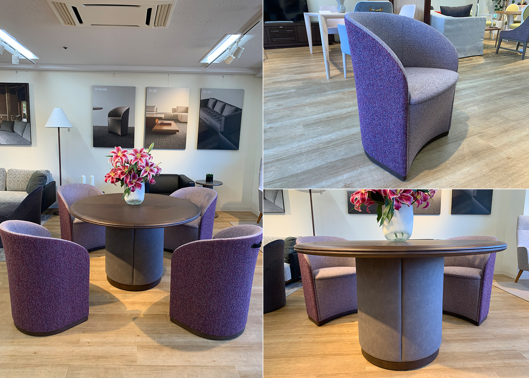 名古屋・栄ショールームに展示しているダイニングセットは、4人掛けでくつろげるφ1200です。ソファセットは3人掛けとオットマンの組み合わせですが、柔らかい印象からか圧迫感もなく、丸みのあるデザインと相まってまとまりのある空間となっています。ダイニングのコンフォートチェアにはオプションハンドルも施されており、機能面だけでなく背面から見た際のアクセントにもなり、優しさや心地よさの中に今の時代に合ったモダンなデザインも兼ね備えています。また、中材やクッション材にもこだわった環境に配慮した家具です。また、新しく追加する張地は、国際基準をクリアした安心・安全なファブリックです。張地そのものの安全性だけでなく、家具の製造過程に携わる全ての人々の安全を第一に考えられています。名古屋・栄ショールームの2023年モデルにもこれらの張地が使用されております。優しいニュアンスカラーと温かみのあるアクセントカラーを合わせたり、異なるピンク系の張地を張り分けて花弁のような彩りを添えたチェアなど、コントラストをもたせながらも優しい雰囲気になっています。アクセントカラーを用いたり、カーテンやラグなどと色をリンクさせたりと、コーディネートの幅が一気に広がりますので、お気軽にショールームスタッフにご相談ください。