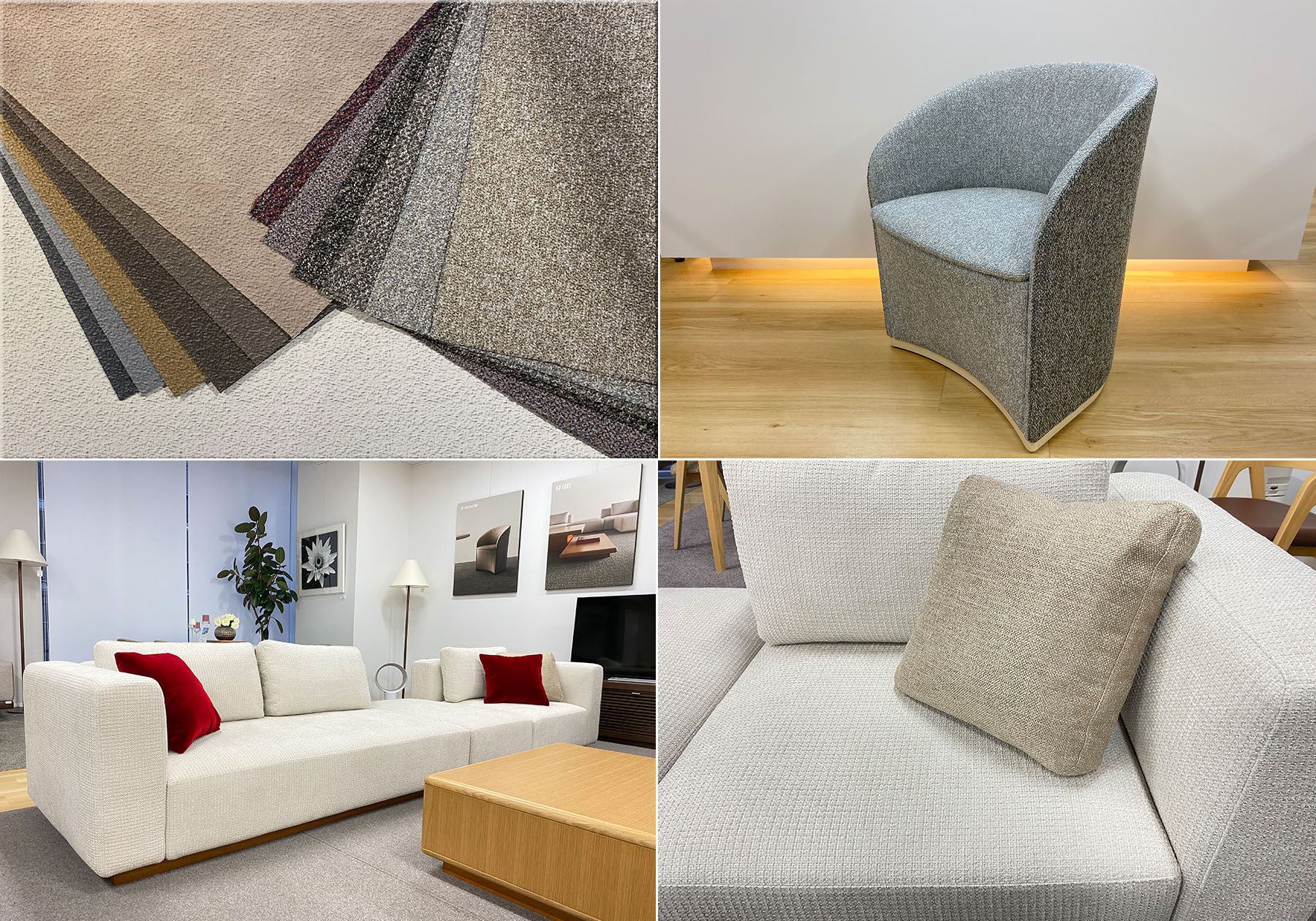 2023 モデルの発表に合わせて5アイテム29色のファブリックが新しく加わりました。人気のグレー系やベージュ系、クッションなどでのアクセントとして取り入れやすいパープル、イエロー、オレンジも加わり、より多くのバリエーションの中からお選びいただけるようになりました。今年はカラーバリエーションだけでなく、環境にも配慮したファブリックを追加いたしました。今回追加されたファブリックは全て有害物質を自主規制し、安全性を認証しているファブリック(エコテックス スタンダード)です。また、環境には配慮したレザー調のファブリックの、ELシリーズも加わっています。ご自宅用からホテルや飲食店、病院、オフィスまで様々なシーンに合わせて楽しんでいただけるファブリックです。また、ショールームの展示品には人気のファブリックの新色を採用しておりますので、製品に張った雰囲気をイメージしていただけると思います。