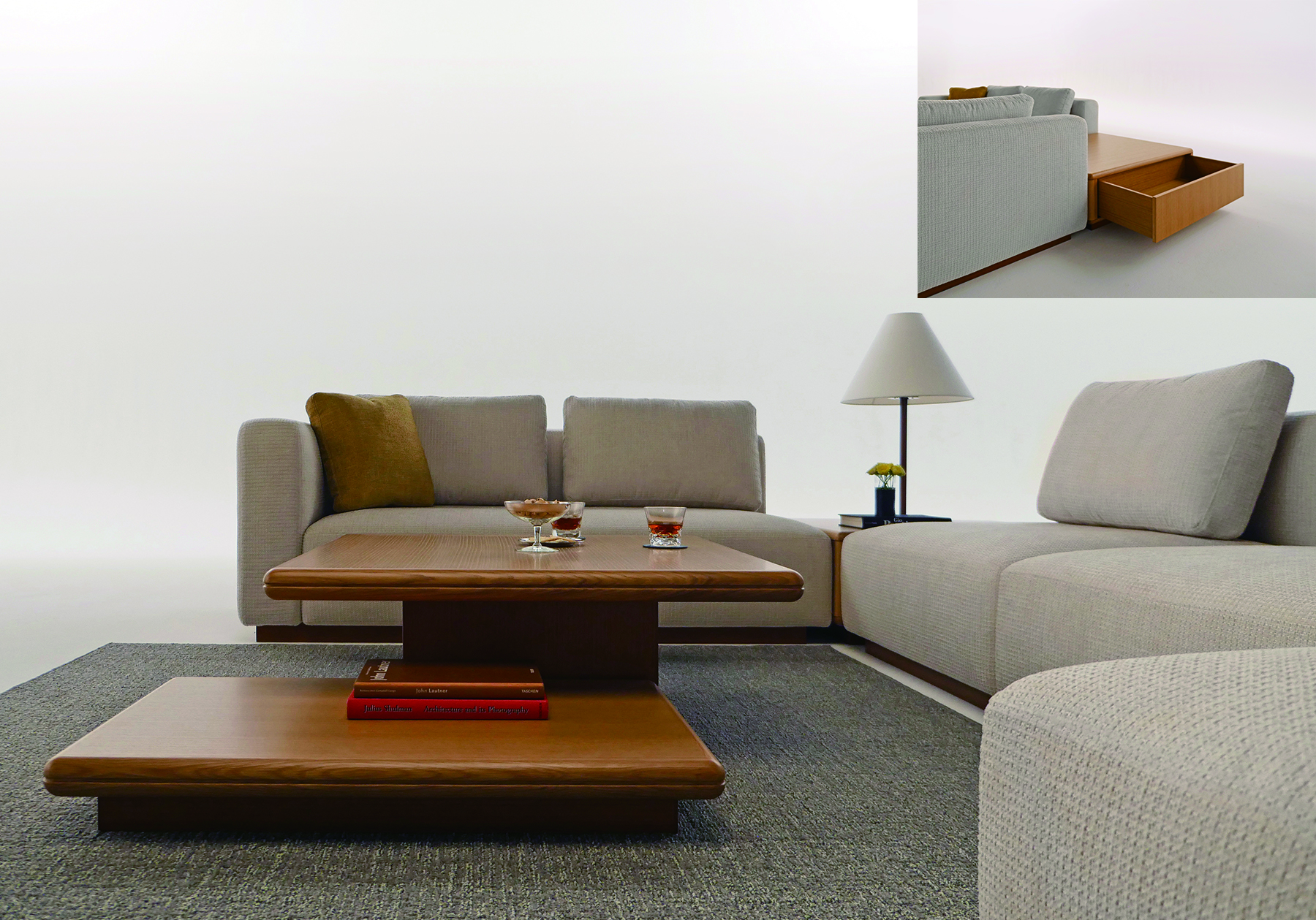 ソファに合わせるテーブルは、ソファの座面の高さに合わせて高さが35〜45cm程度のセンターテーブルが一般的だと思います。スペースに合わせて単体で置いたり、高さが違うものを組み合わせたりソファでの過ごし方によってコーディネートしていただけます。MESSA(メイサ)やMD-212のように抽斗(ひきだし)が付いているものをお選びいただくと、生活雑貨やリモコンなどを収納でき生活感を出さずにお過ごしいただけます。また、MESSA(メイサ)は高さが3種類ありますので、高さ違いを組み合わせることにより様々なご用途でお使いいただけます。システムソファをL字型でレイアウトする場合には、コーナー部分にリビングテーブルを配したりソファサイドに合わせていただくと本や飲み物などを手元に置け、便利にお使いいただけます。MD-1203Wのように二重天板のデザインやMD-206のように棚板が付いているタイプは、インテリアデコレーションの場としても活躍します。最近では、リビングを広く使うためにセンターテーブルを置かないご要望も多いです。そのような場合は、高さがあるサイドテーブルをお選びいただくとソファに引き寄せて使うことができ、パソコン作業をしたり映画を見ながら飲み物を置いたりでき快適にお過ごしいただけます。MD-807BHのサイドテーブルは、MD-805ソファのアーム上に差し込むことができ、よりフレキシブルにお使いいただけます。