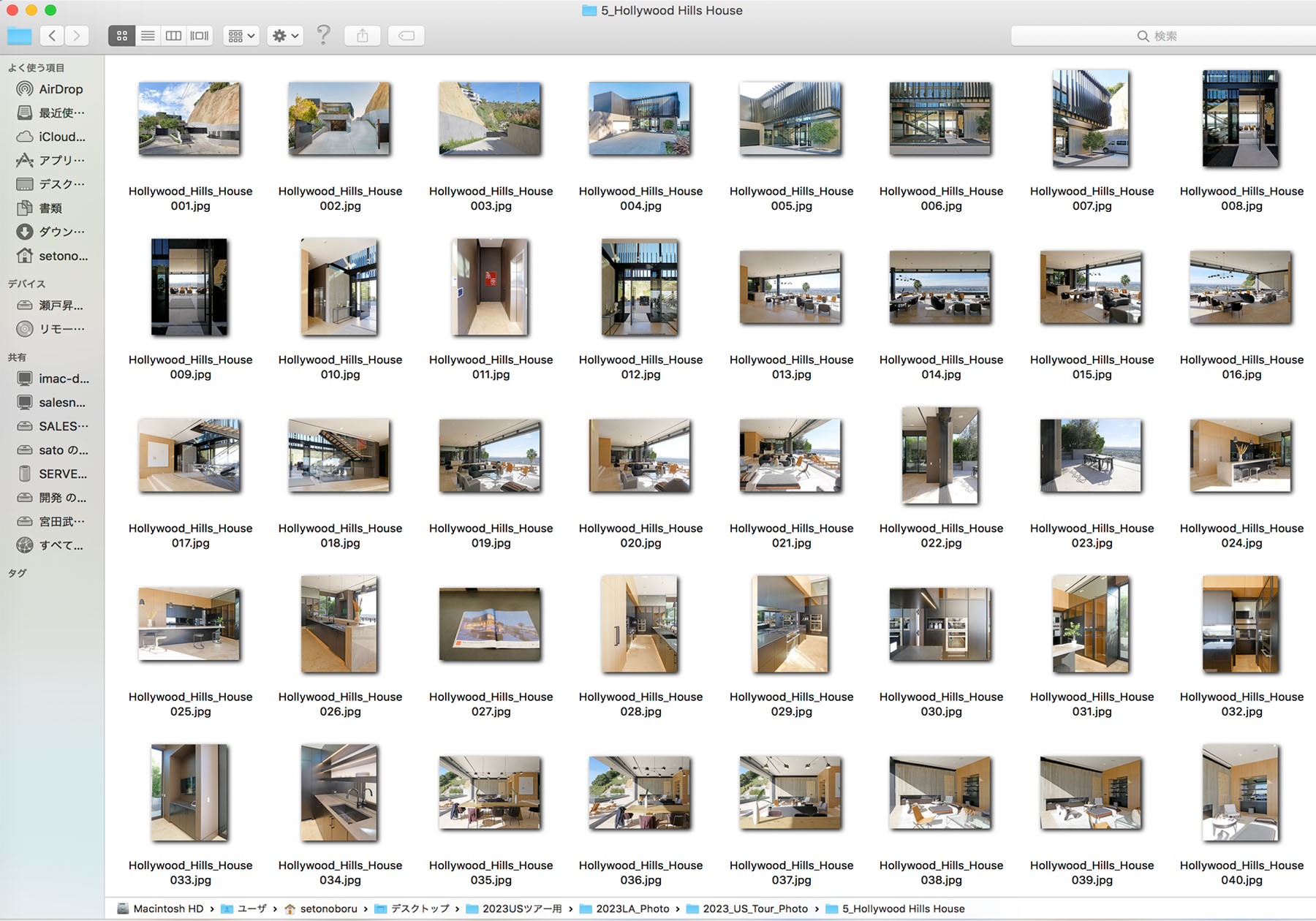 2月に訪問したアメリカ西海岸建築ツアーは取材目的もあり、デジタル一眼レフとiPhoneの両方で三千枚を越える写真を撮影しました。枚数が撮れるようになって困るのが、ベストカットを選ぶ事と訪問した建築の中を歩くように見やすい順に並べる事です。写真の順番は撮影した順でいいのでは?と思われるかもしれませんが、歩ける順が通常通りで無かったり、お客様と一緒のツアーの場合は前だけでなく、逆方向からの撮影は最後にしたり、撮れなかった場所を後で撮る事もあります。また、当社の建築ツアーのように2班になる場合は、1班で撮影して撮り忘れや構図が悪い場合は2班で撮り直します。セミナーでお見せする時はピントの合った構図の良い写真だけでなく、建物アプローチから玄関、リビングからダイニングへ部屋順に見せる事も大切になるので、これに一番時間がかかります。