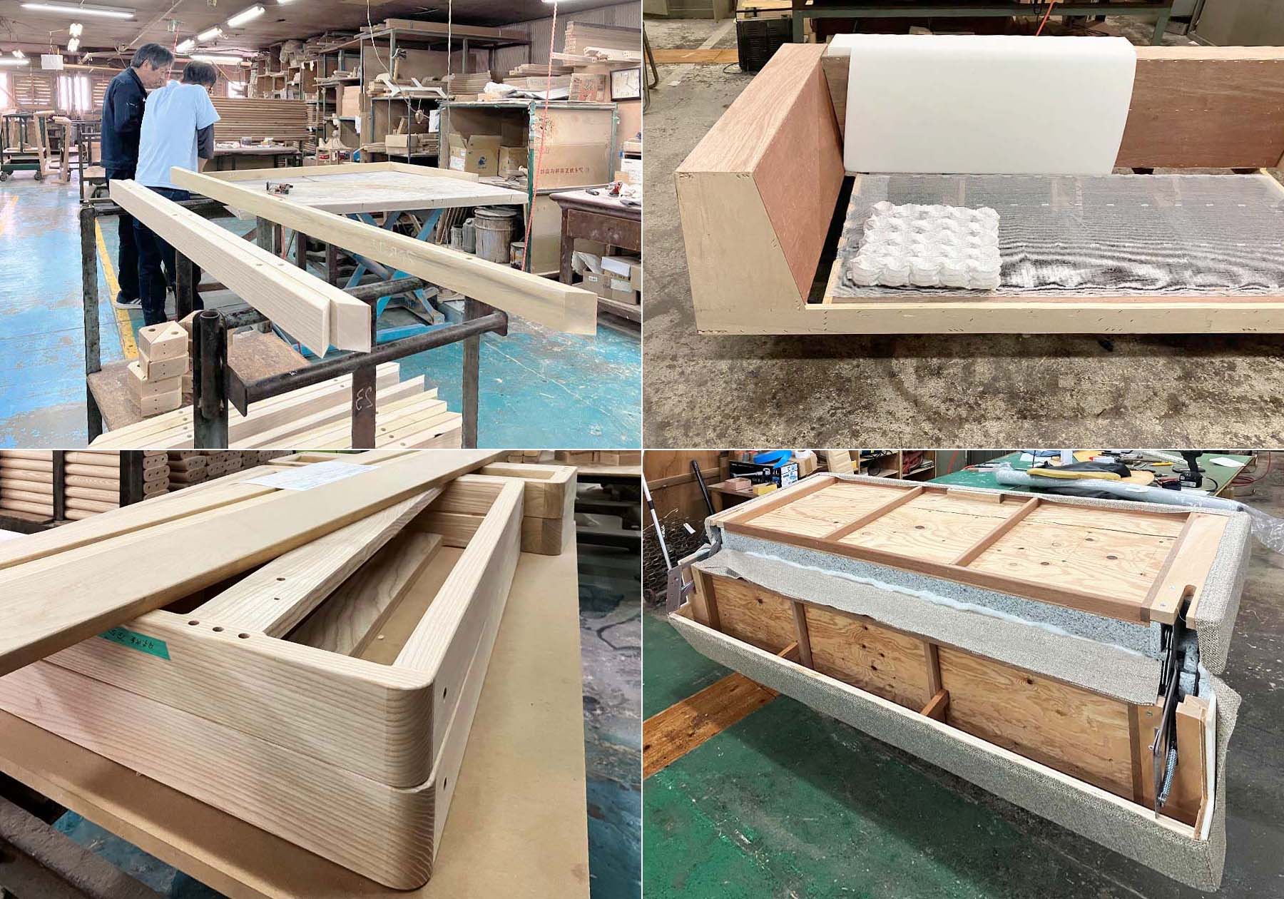 最近では画像のやり取りも抑えどころを双方で理解しつつ、効率も上がってきました。ただし、この2次元のモニターチェックは製品表面の仕上がりや体裁を確認するためのものになります。そのため、見た目を整える事が優先になってきます。見た目の綺麗さ、仕上がりの良さはもちろん大事ですが、それ以上に大切なのが家具の作りの良さです。椅子やソファはデザインの良さを感じながら、触れて座ってくつろいで初めてその良さを実感できます。今回工場にお伺いしてリアルな製品を確認してまわりながら「家具の良さ、家具の心地よさ」を改めて感じました。皆さんも家具のデザインをエーディコア・ディバイズのホームページでチェックしつつ、座り心地や快適さをショールームでぜひお確かめください。(開発 武田伸郎)