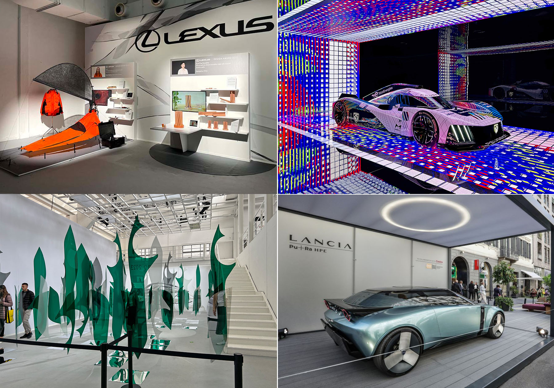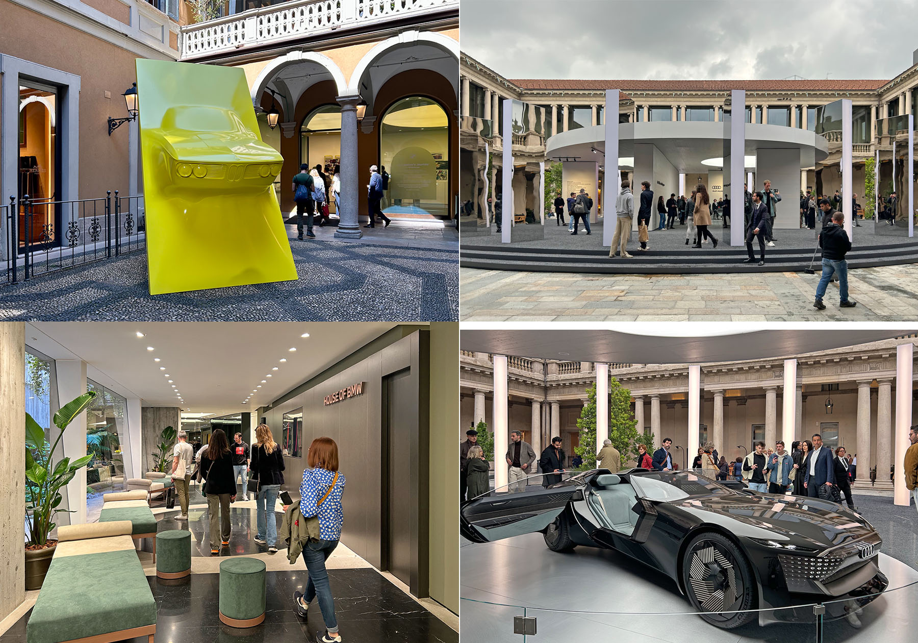 今年も日本のレクサスや世界の車メーカーがコンセプトカーや新型車を展示していました。有名家具ショップが集まるブレラ地区ではイタリア本国しか販売されなくなったランチアが「Lancia Pu+Ra HPE」のカッシーナとのコンセプトカーを展示、ミラノで最も高級ブランドが集まるモンテナポレオーネ通りではBMWやアウディがデザイン展示だけでなく、道沿いに新型車をパーキングしているように停車展示をしています。BMWでは「ハウスオブBMW」として中庭に1973年3.0CLSのフロントマスクをモチーフにしたアート展示を行い、室内では持続可能とラグジュアリーの調和をテーマに、環境に優しいインテリア素材の展示、道路には2023モデルのXMを停車させていました。本国でも珍しいイカついデザインのXMは目を引いていました。