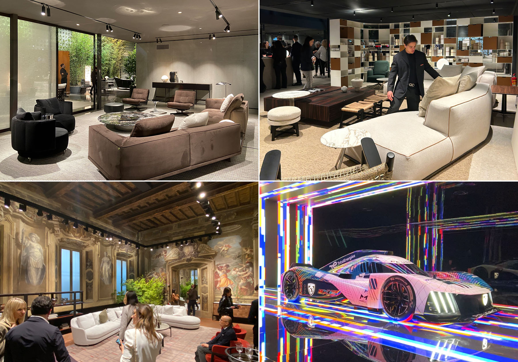 今回は3日間のミラノ滞在で、午前中はサローネ・デル・モービレを見学し午後はミラノ市街のショールームやギャラリーを見学するスケジュールでした。サローネ・デル・モービレの会場については事前にクリエイティブ・ディレクターの瀬戸から「見るブランドを絞って見ないととてもじゃないが見きれない」と聞いていたものの、実際に行って見ると東京ビッグサイト4つ分の広さの巨大な会場にぎっしりと詰まった展示ブースに圧倒されることになりました。特に主要のブランドは展示ブースも巨大で、植栽や外壁など仮設空間であることを忘れるような手の込みようでした。各ブランドともにブランドイメージや新製品の空気感が伝わるブースづくりに注力しており、予算と時間のかけ方が今まで見てきた様々な展示の中でも群を抜いていました。ミラノ市街の展示は自社のショールームだけでなくスタジオや歴史的な建造物を借り切っての展示もあり、入場まで30分以上並ぶブランドもありました。日本国内のインテリアイベントではなかなか考えられない現象ですが、インテリアそのものへの関心が一般人レベルでも高いためなのかもしれません。