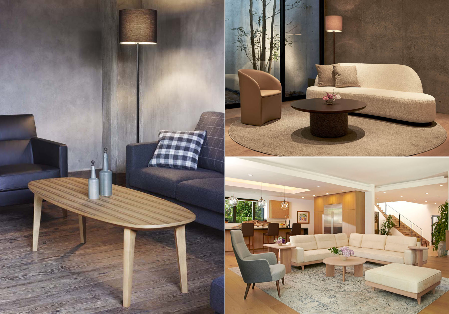 右上:柔らかな円柱の脚部に円形の天板を合わせたエレガントなリビングテーブルMD-3212W。