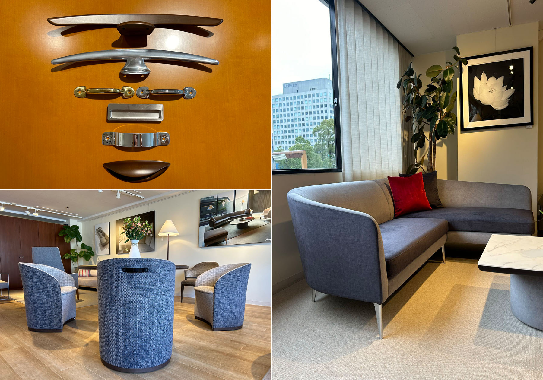 ショールームでは、お部屋の雰囲気やお好みのスタイル写真などをご持参いただければ、イメージに合った家具をご提案させていただきます。木部のカラーは、22色ご用意しています。ブランド毎にAD COREとNEO CLASSICOの規格色は全13色、メープル材をメインとした木肌の優しいセミオープン仕上げの3分艶塗装です。A-modeは製品によって5色と9色、A-mode HeritageとNEO CLASSICO Heritageは9色の展開で、ナチュラルやヴィンテージテイストに合うよう全艶消しのオープン仕上げです。張地はリサイクル原料を使用した環境に配慮したファブリックや、撥水機能や水だけで汚れを落とすことが出来るイージーケアの機能が備わったものもご用意していますので、汚れが心配なダイニングチェアなどにお薦めです。チェアにつけるオプションハンドルは、張地の防汚対策やチェアを動かし易いといった機能面だけでなく、家具のアクセントとしても効果的です。また、MD-1105のソファアームなどはオプション対応となっていますので本革仕様にして高級感を演出することも可能です。