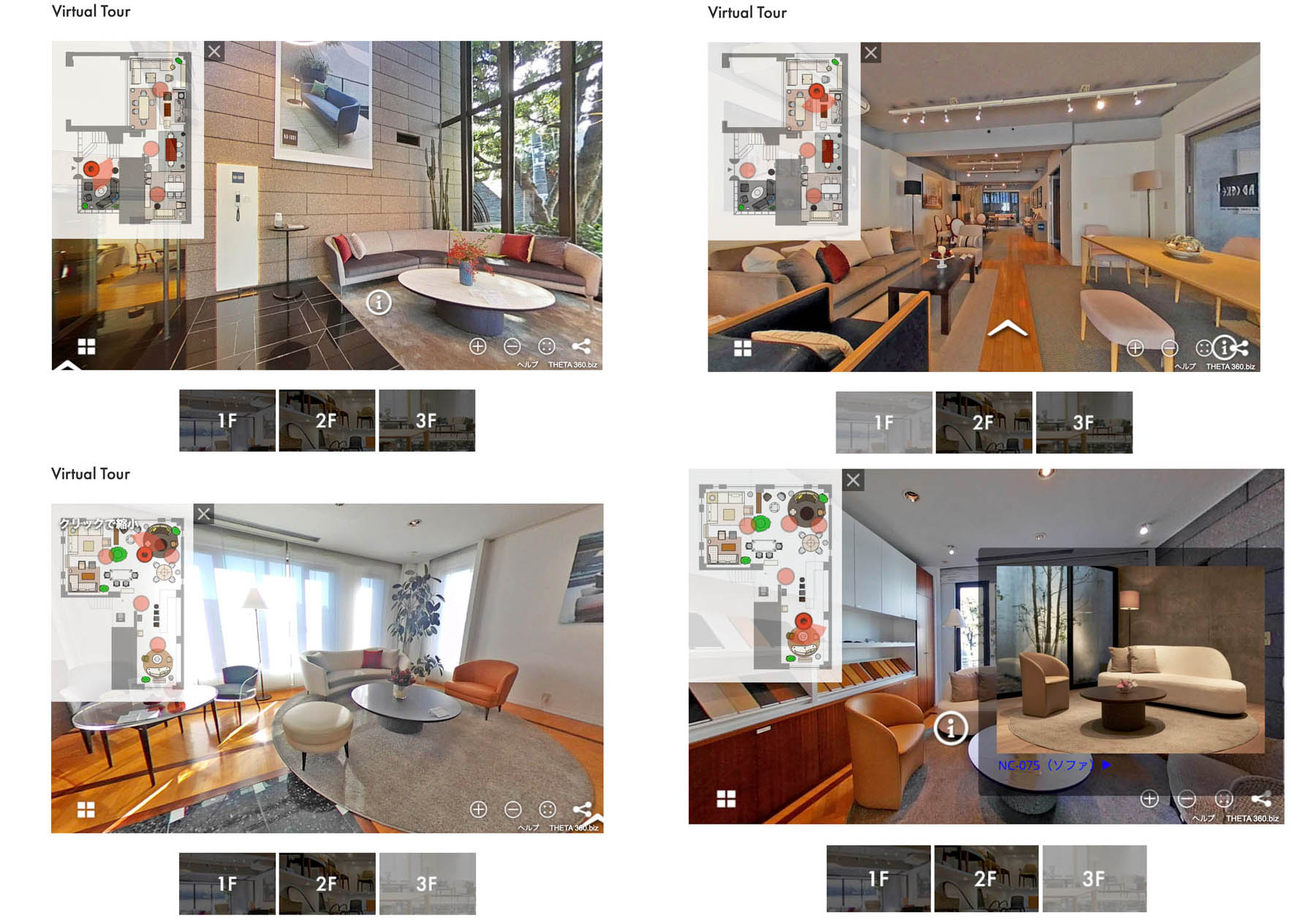バーチャルツアーではエントランスからショールームに入り、実際にショールーム内を動いているかのようにご覧いただけます。ブランドごとにシーン展開をして展示をしておりますので、それぞれのブランドのリビングダイニングのコーディネートシーンがイメージしやすいと思います。また、メイン展示の製品は「i」をクリックするとポップアップで製品の詳細がでてきますので、そちらをクリックするとホームページの製品ページをご覧いただくことができ、製品の詳細や納入事例などをご確認いただけます。
