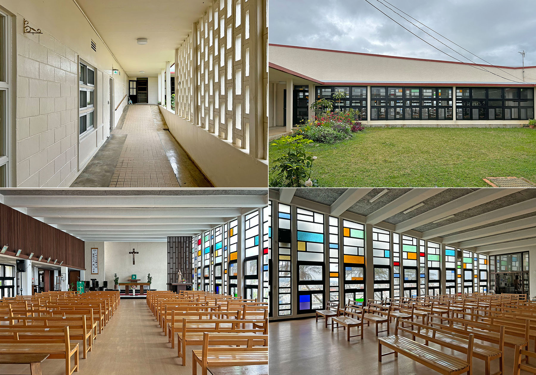 建物は高低差のあるバリアフリーの回廊の中に庭があり、そこから礼拝堂の中に入ると、片側全面の色ガラスから柔らかな光が礼拝堂のベンチを包んでいました。曇りの夕刻でもこの光なので、晴れた日は光の中にいるような空間になると感じます。この建物は1947年にバチカンの要請でグアム島から宣教のため沖縄にやってきたアメリカ出身のフェリックス・レイ神父の主導により建てられたました。建物の完成は1958年で、設計を担当したのは在日米軍建設部所属の日系人建築家・片山献と、シカゴに本拠地を置く建築設計事務所SOMです。1958年は第二次世界大戦で壊滅的になった沖縄では街の復興はまだまだの時期で、丘の上に建てられたモダン建築から見えるステンドガラスは復興のシンボルになりました。風が内部空間に良く通るように穴の空いたコンクリートブロックと沢山のガラス扉が開けられるようになっていて、冷房設備の無い時代の工夫が多く見られ、それがモダンデザインになっています。