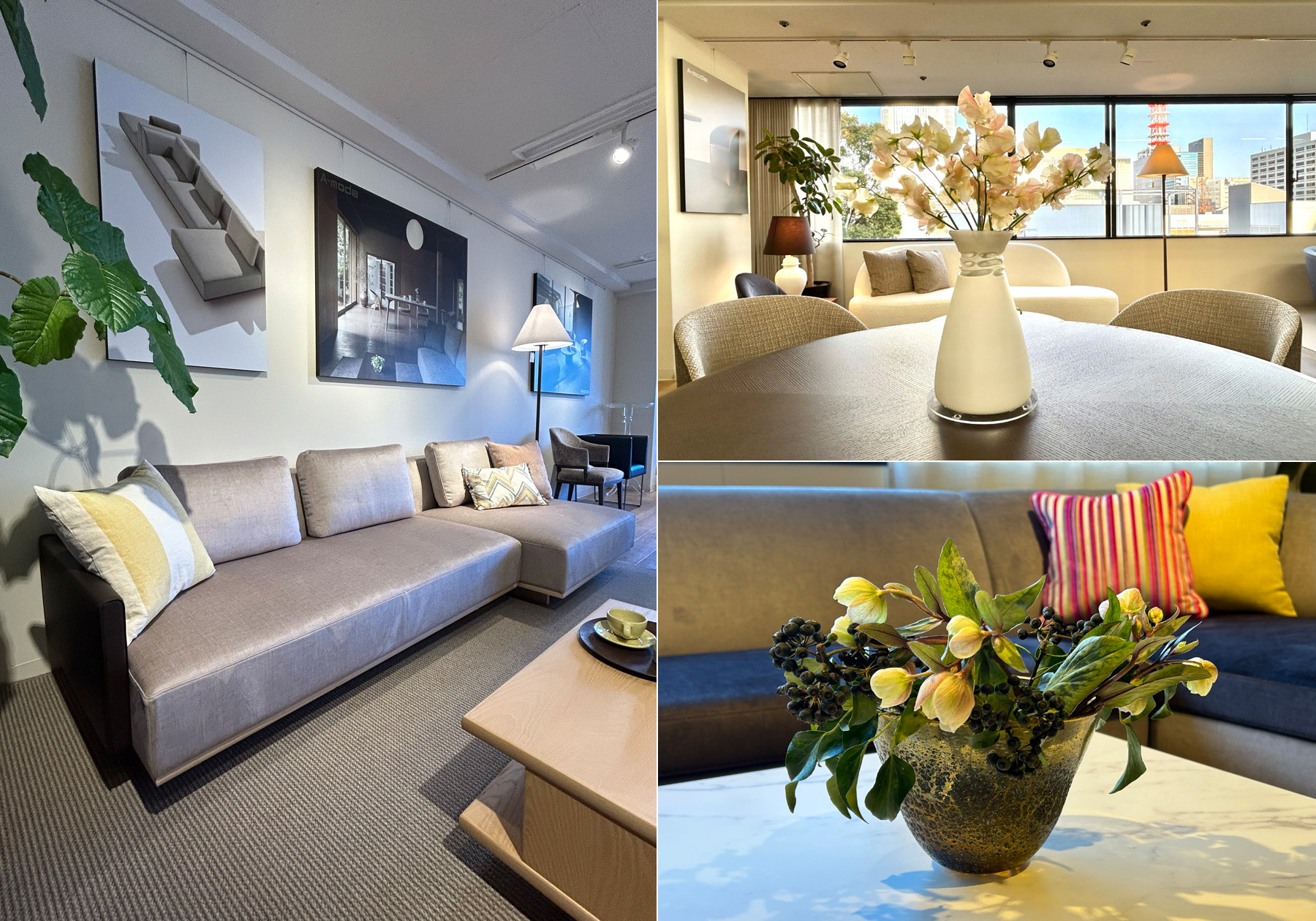 エーディコア・ディバイズの各ショールームでは、ディスプレイを春の装いにチェンジしました。2024年モデルのMD-3211ソファセットにはビバーナムをアレンジ、キャスター付きもお選びいただけるMD-1301チェアのダイニングセットには、イエローとピンクのグラデーションが愛らしいスイートピーを白い花器に飾りました。この時期のフラワーショップは、色とりどりのお花が一年中で一番豊富な季節なので、訪れる度にワクワクします。ショールームでも春の訪れを感じていただけるよう、月が進むごとにお花を活け変えています。手軽に雰囲気を変えられるクッションも春仕様にし、アースカラーのソファセットに淡いピンクやイエローのパステルカラーのクッションをディスプレイすることで、一気に春めいた表情に変わりました。2024年モデルから中材にリボンテッドフォームを90%以上再利用したクッションも販売しています。リボンテッドフォームはウレタンフォームの端材をまとめたチップウレタンで、材料を無駄にしない環境に優しいクッションです。春色のクッションカバーをチョイスして、気分も晴れやかにコーディネートをお楽しみください。