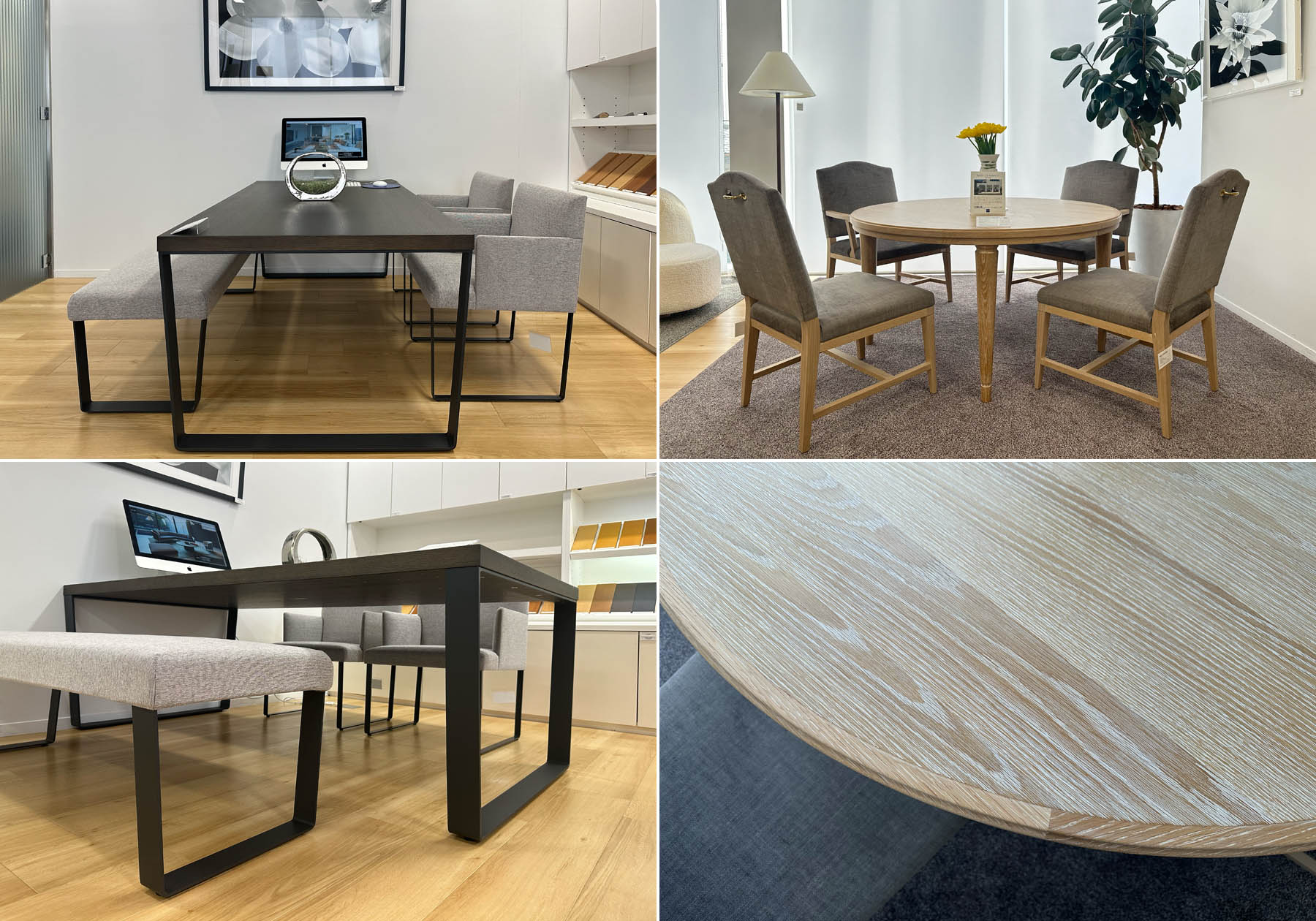 春といえば新生活が始まる時期でもあります。各ショールームでは新生活に向けて家具選びのアドバイスなど積極的に対応しています。そこで、大阪・心斎橋ショールームの展示品で人気のダイニングセットをご紹介させていただきます。1つ目はスチール脚が特徴的なMD-105N(テーブル)・MD-101(チェア)、MD-101BC(ベンチ)のダイニングセットです。選ぶ塗装色によってカジュアルなシーンだけではなく落ち着いた印象にもなり、幅広いお客様からとても人気です。テーブルの脚部は4段階に付け替える事が可能で、長手方向に座る人数によって変更ができる点がとても好評です。ベンチは座る人数がフレキシブルですので、来客時にも便利です。2つ目はNC-052、NC-051BCダイニングセットです。テーブルは素材感を活かしたうずくり加工の天板がとても人気です。キャメルバックの背のデザインが特徴的なチェアは座面が大きく、柔らかい座り心地です。デザインに興味を持って下さる方が多く、「ホームページを見てきました」と言われることが多いです。大阪・心斎橋ショールームでは円形テーブルを展示していますが、長方形のデザインもございます。エーディコア・ディバイズの家具はモダンなテイストやクラシックなテイストなど豊富なバリエーションがあり、ご自宅やお客様の好みに合わせて色や張地をお選びいただけます。ショールームでお気軽にご相談ください。