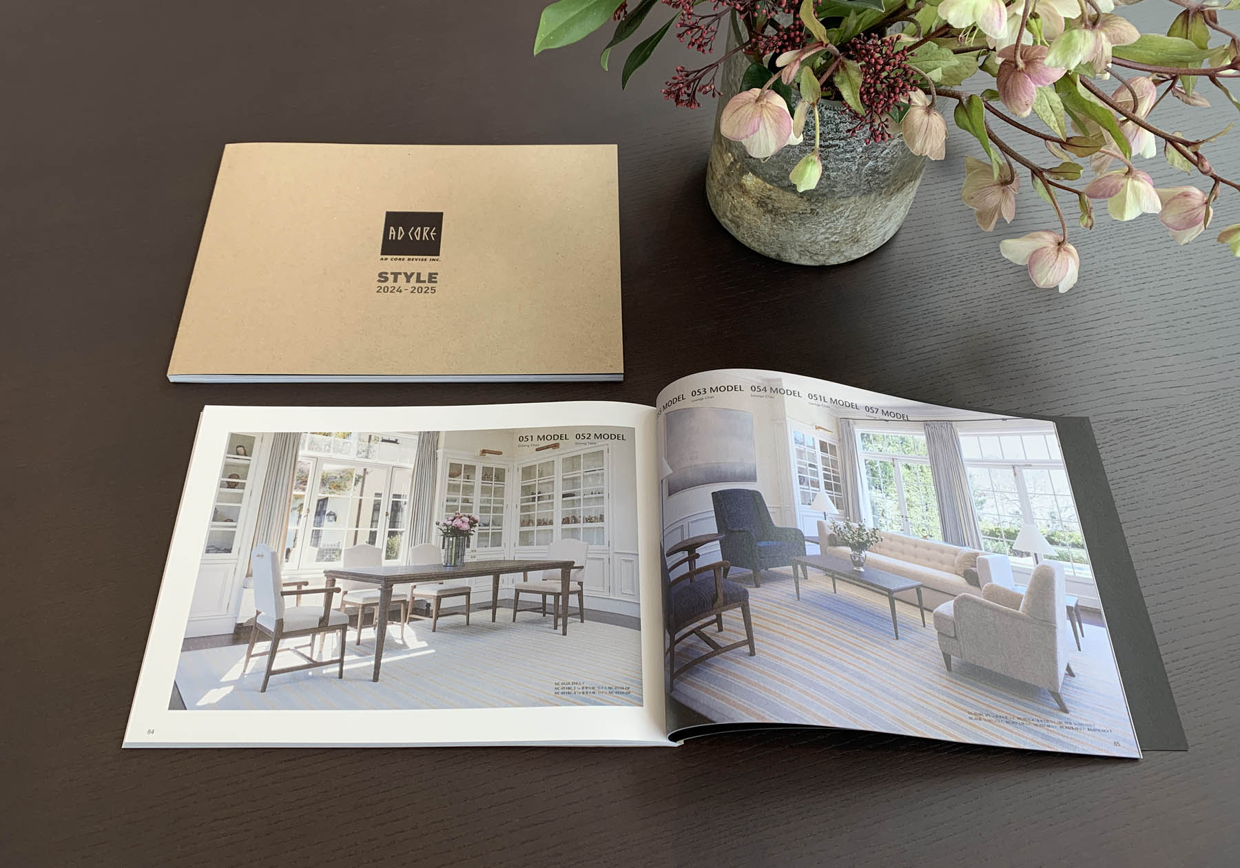 AD CORE DEVISEのホームページでは、製品の単品写真の他にインテリア空間にセットしたコーディネート写真を掲載しています。コーディネートしたイメージ写真の多くはアメリカ西海岸で撮影しています。製品のテイストに合わせてロケハンを行い、家具とインテリア空間がお互いに引き立つような住宅をお借りして撮影しています。照明やアート、オブジェなど実際にお住まいの空間にデコレーションされているものなので、内装と家具、アートとのコーディネーションなど、これから家具をご検討する方にはとても参考になると思います。イメージ写真を抜粋してまとめたSTYLE BOOKは見開きでダイニングとリビングをコーディネートしていますので、空間全体のイメージを掴んでいただきやすい構成になっています。当社では、カリフォルニアスタイルをイメージしたA-mode、イタリアンモダンデザインを意識したAD CORE、クラシカルなフォルムの中にも現代的なラインを表現したNEO CLASSICO、アクリル樹脂と木素材を組み合わせたPMMA+Woodと4つのブランドがありますので、それぞれのブランドのコーディネート写真をご覧いただくとお好みのテイストやインテリアの方向性をイメージしていただけると思います。ホームページからはPDFのカタログをダウンロードできますので、ぜひご覧いただきインテリアコーディネートの参考になさってください。