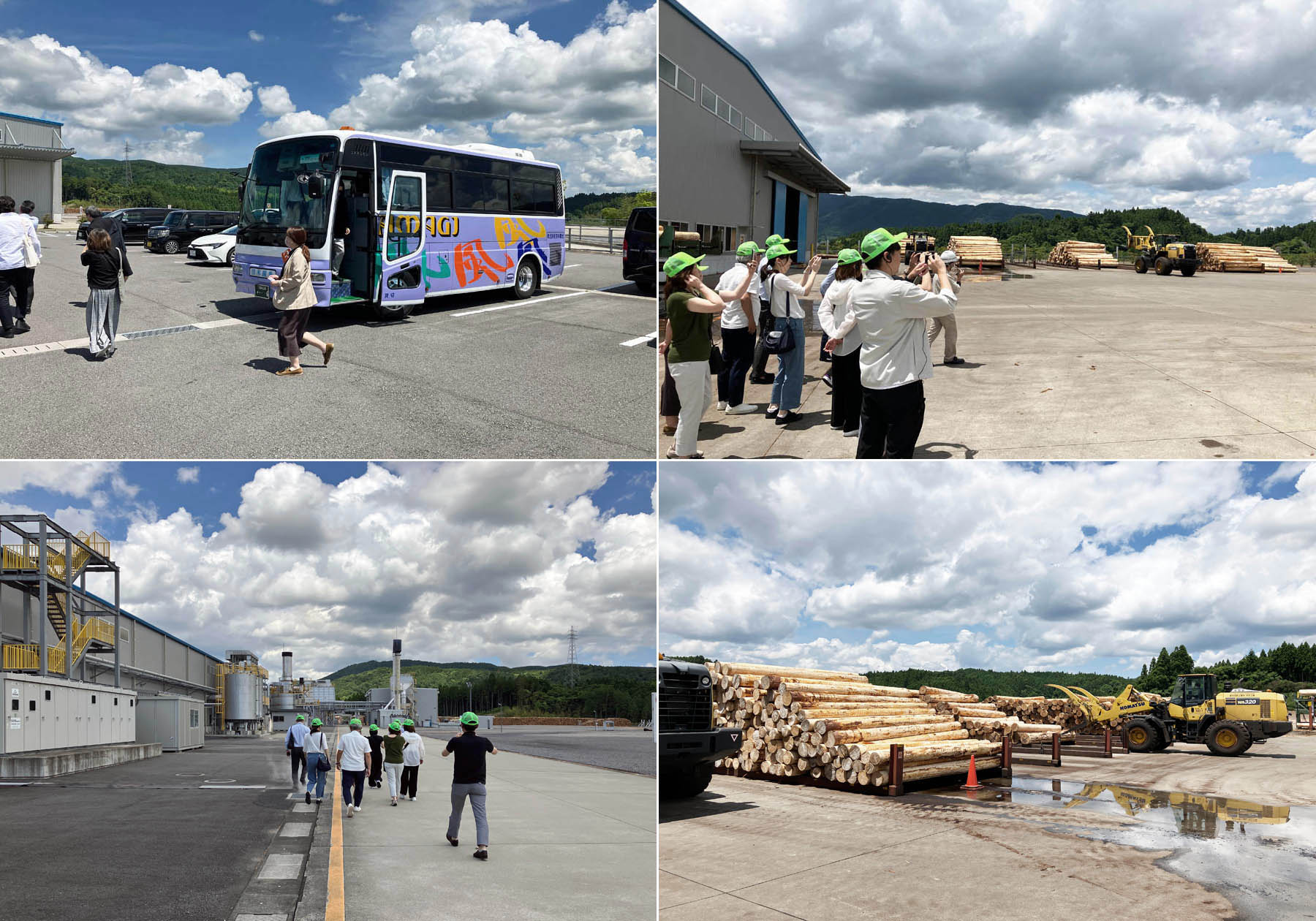 初めに訪問したのは、昨年の新製品から本格的に採用を開始した国産針葉樹合板の工場です。新製品に採用するにあたり、昨年初めて工場を見学させていただいたのですが、とても素晴らしい工場だったので今回全員で訪問させていただきました。九州の山間に広がる広大な敷地、檜の香りがする敷地内には九州から集められた針葉樹の丸太が整然と積み上げられていました。建物の中だけでなく屋外の貯木場までゴミ一つ落ちていない綺麗な工場です。木材を加工する工場で、これだけきれいな工場を見たことがありません。高度にオートメーション化された工場は、加工途中で発生する廃棄物から熱、蒸気に至るまで一切の無駄なく効率的に利用されています。資材の組み合わせ選別等もAI技術を利用し、目にも止まらぬ早さで処理していました。こんなに効率的に製品が出来る工場を見てしまったら「機械化すれば手間をかけなくても製品が出来るのでは?」と、思ってしまいがちですが・・・合板製造の肝心要の作業である、最終のプレス作業前の単板セッティングは2名体制で人の手で行っていました。どんなに自動化されてもこの作業だけは熟練した人の目でチェックする必要があるのだそうです、納得!!