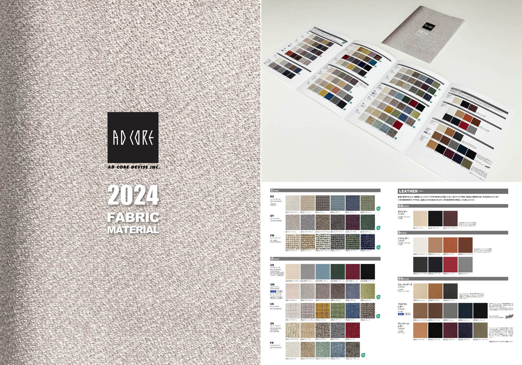 エーディコア・ディバイズの規格ファブリック、147種は、ホームページにて閲覧いただけるようになっています。合わせて、印刷物のA4冊子「FABRIC MATERIAL」もご用意していますので是非ご活用してください。以前の規格ファブリックのセレクトは、印刷物の総合カタログとの兼ね合いもあり、アイテムの見直しや精査は1~2年ごとでしか実施できませんでした。しかし現在はSDGs対策として、総合カタログの印刷物を廃止したためよりフレキシブルに対応できるようになりました。現在、新製品の開発に合わせて新たなファブリックのセレクトを進めています。ニューモデル発表の際には、新製品と合わせてファブリックのご提案にも注目してください。(開発 武田伸郎)