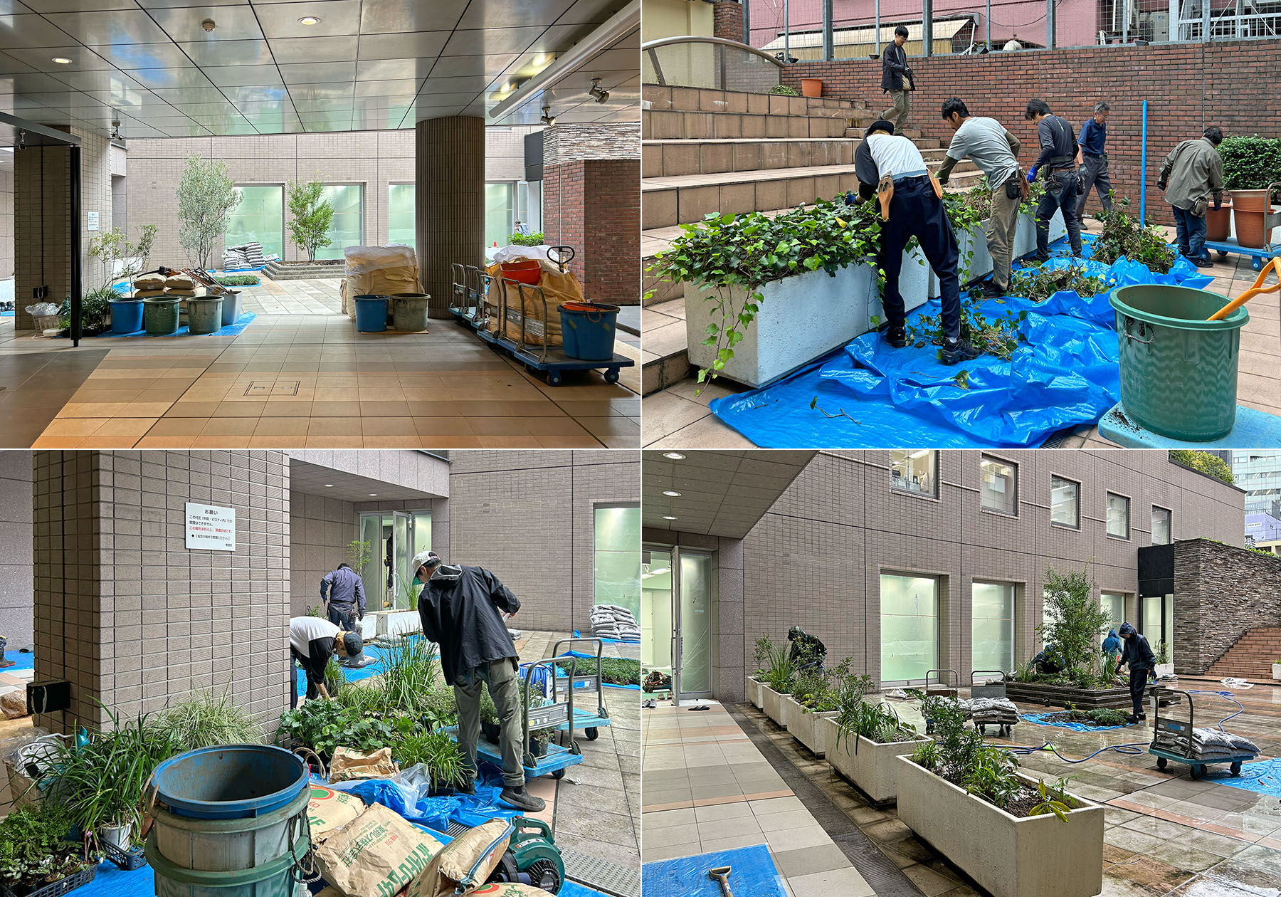 ビルオーナーにはビルの植栽を自前でやらせて欲しいと言うテナントは初めてと驚かれましたが、許可をいただける事になり契約となりました。12月初めにオープンなのですが10月末までが植物の根付け時期限界なので11月になる前に植栽施工を行いました。ビルの中庭は地階に駐車場がある場所なので植え込みの土はとても浅く、通路を仕切るためのプランターポットが多く使われていました。オーナーに許可いただいたレイアウトとイメージ図を基に植栽会社の方と打ち合わせをして植物選定をして工事を行いました。植栽会社の担当者はとても若い方でしたが植物が大好きな方で、作業現場でもベテランの職人さんと一緒に作業をして手際よく草木をレイアウトしていきます。最初は心配でしたが、仕事ぶりの良さから任せる事に決めて見ていました。植栽の難しさは植付けから1年以上経た姿が完成になるので、それを予想できるかで、完成した庭は今は寂しいかもしれないが、来年の春には素敵になりそうな気がする庭になりました。