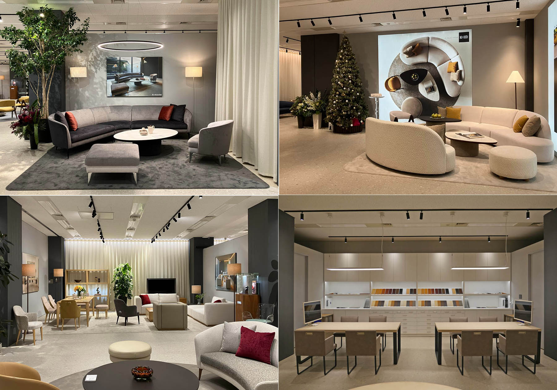 右上:エントランスを入った正面には2025 MODELのNC-075ソファを展示しています。