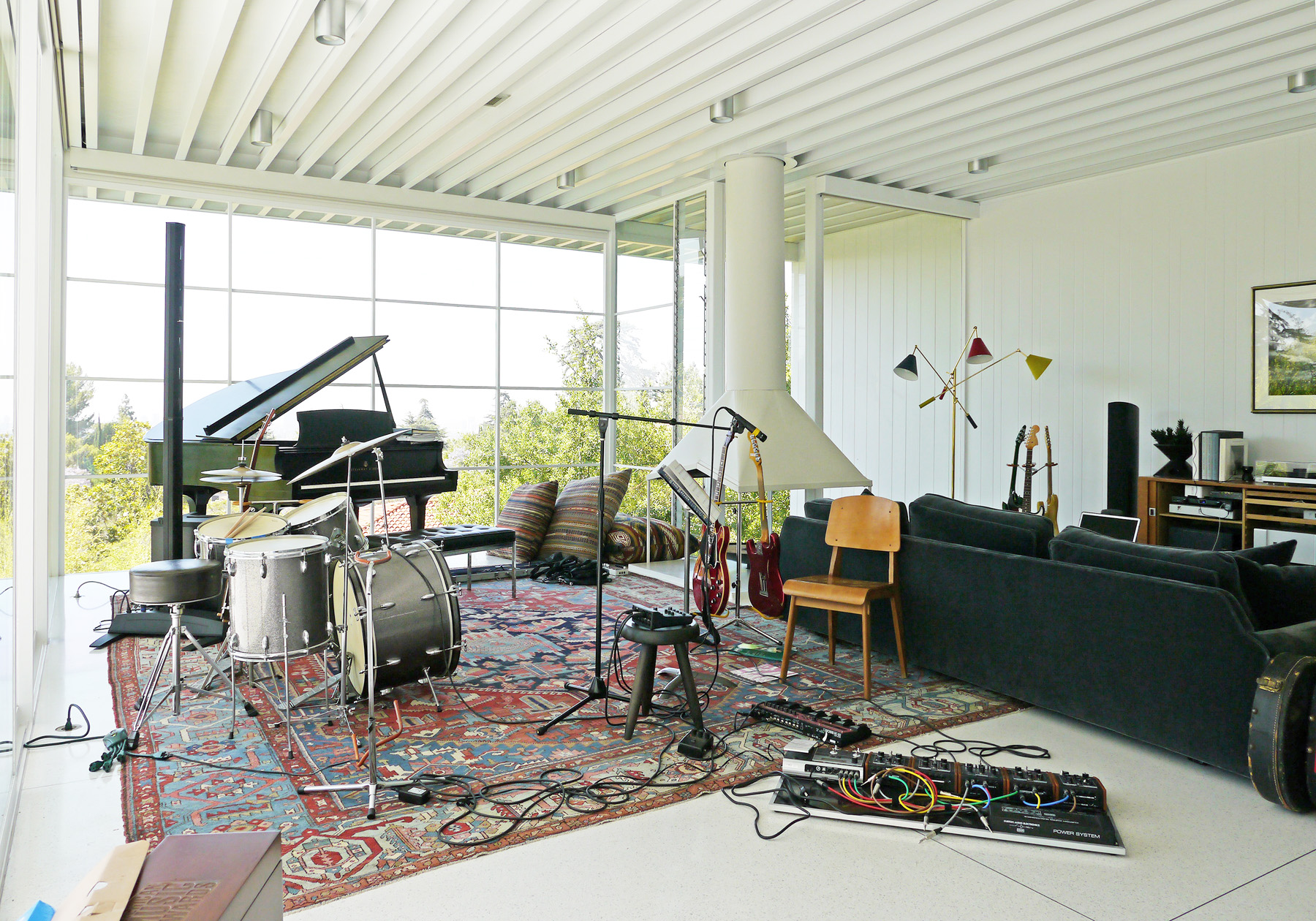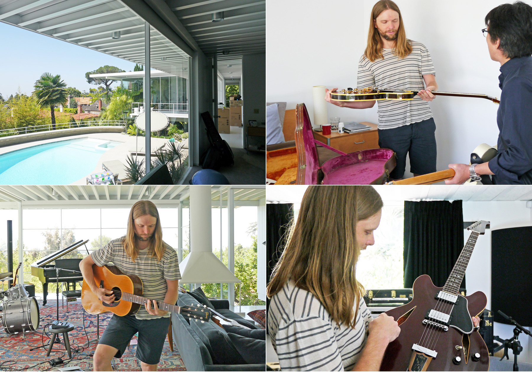 当時彼がお住まいだったのがスチールフレームに水平ラインの屋根、屋外プールが印象的なミッドセンチュリースタイルの住宅。1960年にニール・M・ジョンソンが設計したスチールハウスと呼ばれる住宅でした。室内に入ると、ガラス張りのリビングにはドラムセットとギターをはじめ音楽機材が所狭しと並んでいました。素人ではないことはすぐに分かりましたが「僕はミュージシャンでギタリスト。マルーン5というバンドで日本の武道館でも演奏したことがあるよ」と言うジェームスさんの言葉にも、私をはじめ訪問したスタッフはマルーン5の知識がほとんどなく「マルーン5?聞いたことがあるけど・・・バックバンドのギタリスト?」残念ですが当時はそんな反応しか出来ませんでした。部屋の中のスタンドに掛けてあるギターやケースは貴重なヴィンテージギターばかり。興味津々で眺めていると、ケースから取り出して説明をしてくれたり、目の前でギターを弾いてくれたり、さらには「弾いてみなよ」と、貴重なギターをアンプに繋いでくれたりしました。自分の大切なギターは他人に触れさせたくはないものですが、そんなそぶりも全くなくとても気さくな方でした。ロサンゼルスでカタログ撮影ロケハンでの素敵な思い出です。