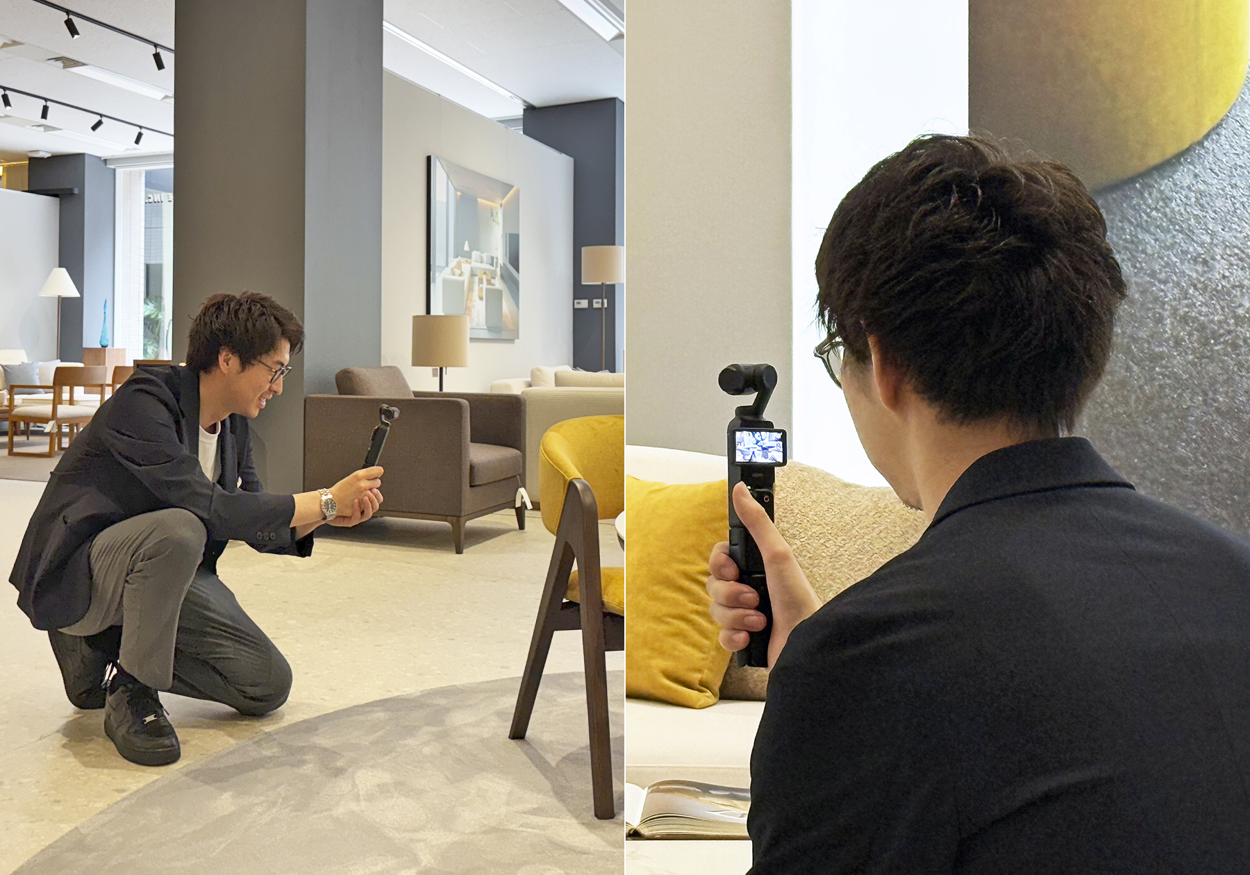OSMO POCKET 3は、近年のYouTubeやSNSでも多くのクリエイターに使用されている、コンパクトで高性能な4Kカメラです。手ブレ補正を備えたジンバル機能や1インチセンサーによる高精細な描写によって、家具の繊細な木目やエッジの柔らかさ、光と影の移ろいまでも、驚くほどなめらかに、リアルに映し出すことができます。今まではiPhoneをジンバルにセットして撮影しておりました。十分に高品質な動画は撮れていると思っていましたが、、、iPhoneのセンサーサイズには限界があり(1/3.6インチ程度)、質感や陰影の細かな描写には弱い部分があります。OSMO POCKET 3は1インチセンサーと3軸ジンバルを本体に内蔵し、セッティング不要で安定した滑らかな映像が撮れるうえ、細部までリアルに表現できます。見せることにこだわる私たちにとって、この性能差は大きな決め手になりましたし、実際にこのカメラで撮影した動画を公開してから、「最近すごく動画の質が上がりましたね」「動画を見て実物を見たくなって来店しました」といった嬉しいお声を、お客様からいただくことが増えてきました。