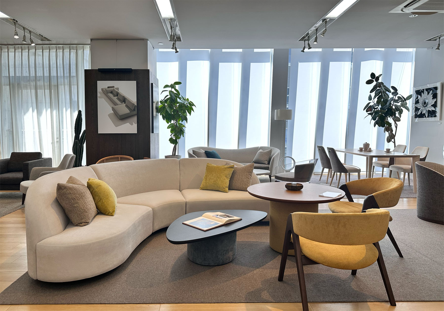 大阪ショールームではダイニングセットは4セット、ソファセットは5セット、他にもダイニングチェア、ラウンジチェア、カウンターチェア等を展示しております。展示している木部、張地もそのままご選定いただけますので、お気に召されたものがありましたらお声がけください。お部屋の図面をお預かりして、プランをお作りすることも可能です。是非ご相談ください。