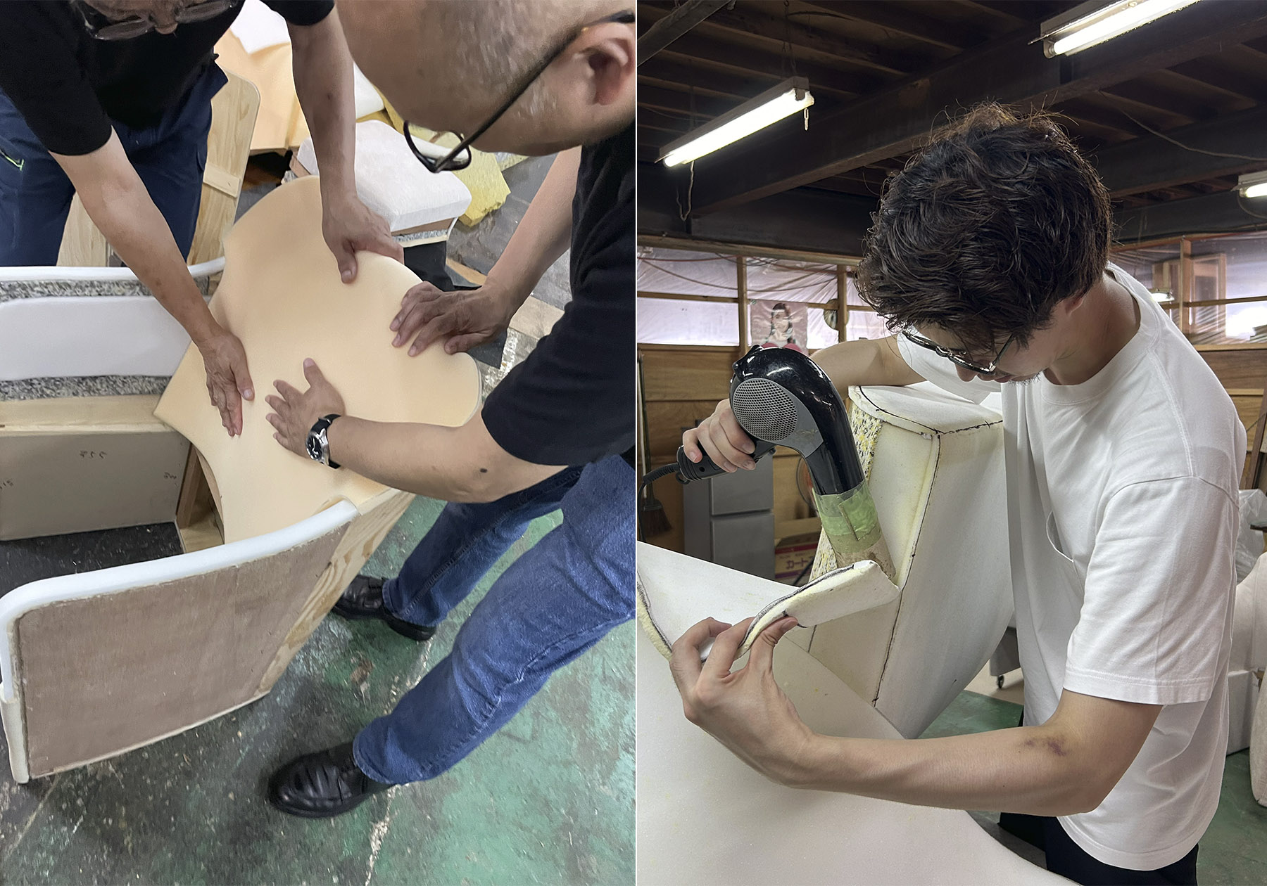 新しい製品づくりは、一般的にはイメージスケッチから図面に起こすところから始まると思われがちです。しかし当社では、代表の瀬戸が日頃からインテリアの未来のトレンドを意識し、海外での視察も踏まえながらストーリーやコンセプトを構築することから始まります。コンセプトが定まって初めて製品を図式化し、試作づくりへと進んでいきます。今回の9月頭の工場訪問では、第一試作が完成し、実際に座って確認しました。図面上で抱いていた印象と異なる点が多くあり、特に、私は身長190cm近くあるため、、、一般的なサイズ感覚を把握するには努力と工夫が必要です。ほんの数センチの高さや角度の違いが座り心地を左右し、平面上では気づけなかった課題が浮かび上がってきます。工場内は36度前後で、職人さんたちは「これでも例年よりはマシですよ」と笑っていましたが、暑さに弱い私はただ尊敬するばかりでした。