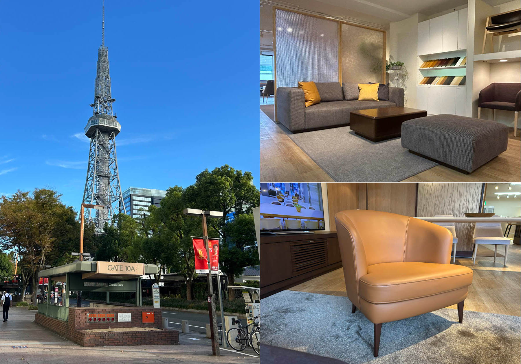 名古屋・栄ショールームは、栄のランドマークでもあるテレビ塔のすぐそばにあります。公共交通機関でのご来場がとても便利で、地下街から地上へ上がる「GATE10A」を出ていただくと真正面のビルの3階にショールームはあります。コンパクトなショールームですが人気の製品は網羅され、セット物だけでなくラウンジチェアやランプ、単品チェアもご覧いただけます。