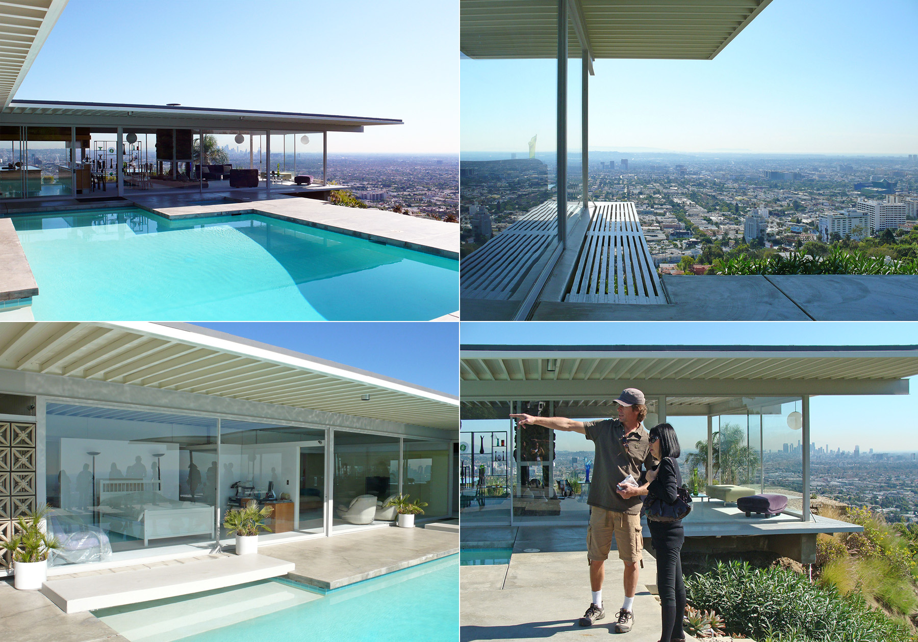 アメリカ中流階級の人々に安価なプレハブ建築の魅力を知ってもらうために米建築雑誌「アーツ・アンド・アーキテクチュア」が企画した実験的住宅建築プログラム「ケース・スタディ・ハウス」の22番目の建築として建てられたスタール邸は、完成後すぐに写真家ジュリアス・シュルマンがこの家を撮影し、開放感とハリウッド市街が見える景色のあるモダン建築として世界一有名な住宅として有名になりました。奥様からは建築時の話や住み心地や、さまざまな雑誌や映画やテレビドラマに使われて、楽しかった思い出をお聞きしました。ガラスの面積が大きいので冬は寒く、夏は西陽の日差しが暑く、雨が降ると屋根の音がうるさくて、住み始めた頃はけっして快適ではなかったとのことでしたが、シュルマンの建築本で有名になったことで、さまざまな撮影で有名人に会えたりして楽しいことも多かったと笑いながらお話ししていただけました。