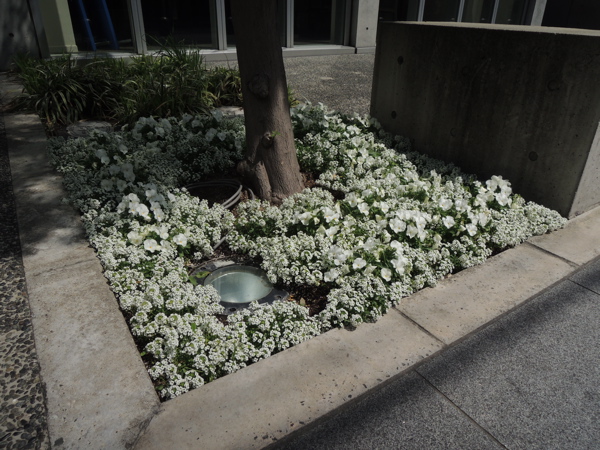 白い花が満開です!植木も新しくなり、この辺りでは唯一の小さなガーデンのようになっているので、天気がいい日には、オブジェのブロックで一休みされる方も見られます。