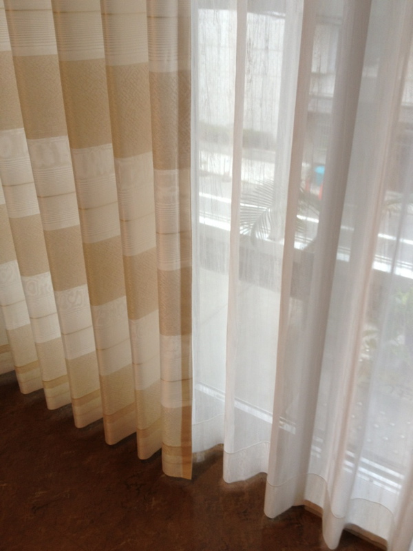 エーディコア・ディバイズ大阪心斎橋ショールーム内中央に位置するバルコニー前に、フジエテキスタイルさんにご協力頂き2種のカーテンを設置しました。
