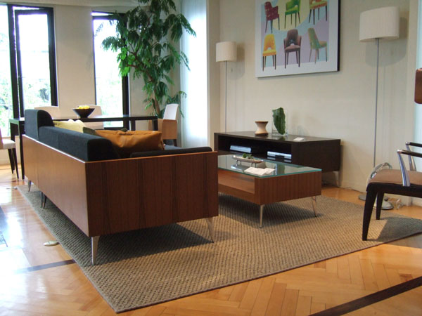 インテリアに欠かせないものの1つにラグマットがあります。ラグマットを敷くことにより、上質な空間を演出するとともに、音を吸着したり埃を舞い難くするというメリットもあるそうです。ショールーム1階のNEO CLASSICO のクラシカルモダンな空間には、ナショナルインテリア JAB社の毛足のあるグレーのラグを配しました。 JAB社のラグはデザインやカラーバリエーションがとても豊富で、光沢が美しく華やかなラグです。またポリアミド100%で遊び毛があまり出なくてお手入れがしやすく、床暖房にも対応しているのでお客様へもご提案しやすい商品です。