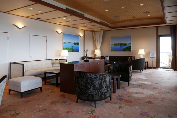 和の趣きのあるエントランスからロビー廻りは、A-Mode(エーモード)ブランドの製品を透明感のあるナチュラル色にする事によって、既存インテリアと巧く馴染ませ、キッズコーナーやウェイティングベンチなどは別注で設えました。ラウンジは、NEO CLASSICO(ネオクラシコ)ブランドで揃え、ウェディングなどに対応するためにレイアウト変更しても統一感の出るような仕立てになっています。また、壁にかかったアートパネルは、瀬戸が撮影した松島の風景の写真を当社のカタログのディレクションをお願いしているグラフィックデザイナーの高原宏氏に手をかけていただきアートにしました。常に明るい時間の松島を堪能していただく狙いです。