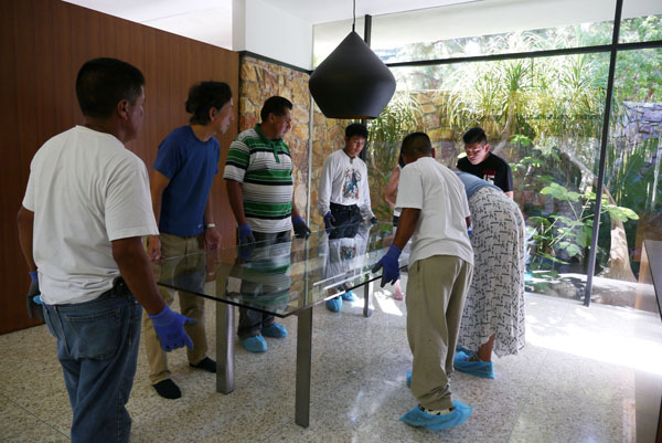 家での撮影は本当に大変です。それはお借りする家はオーナーが住んでいるからです。元々あった家具を撤去して、そこに当社の家具達をレイアウトして撮影し、またオーナーの家具を元通りに置いて、テーブルの上の小物を撮影前に撮っていた写真を見ながら寸分違わないように元通りにして、クリーニングして終わる事です。一日4回引っ越しをして、飾り付けもするようなもので、本当に大変です。その全てを私達自身と手配した手伝いのスタッフと行います。それも床や家具に傷を付けないように細心の注意が必要です。今回もグアテマラの人たちにお願いをして作業しました。開発の武田君が指示しながら作業を進めますが、英語もあまり話せない人たちなので、大変です。