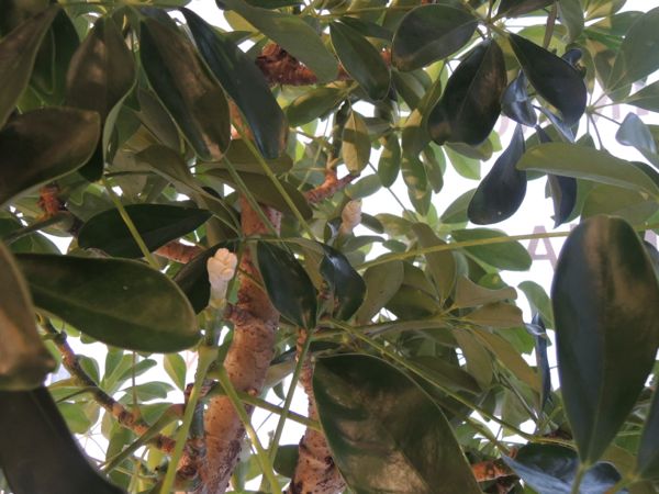 シェフレラは稀に花や実をつける事があり、それには気温が大きく関係しているとの事。沖縄ではよく花が咲く事があるそうですが、本州で花が咲いたり実がつくことは珍しいそうです。特に庭木ではなく鉢植えではなかなかないとの事。。やはり今年の夏の暑さと厳しい残暑が原因のようです。2本のうち窓際に設置していたものだけがたくさん蕾をつけ、もう1本の窓から少し離れた場所に設置している方は全く蕾をつけていませんでした。日中の日差しから家具を守るためロールスクリーンを降ろしていますが、それでもシェフレラにとっては蕾を付けるのに十分な太陽を浴びていたようです。