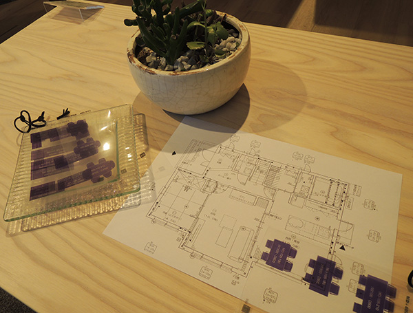 そんなときに便利なのが平面図。ショールームでは1/50の家具図面プレートをご用意しております。実際にお手持ちの図面に置いてみるとバランスの確認やイメージをしていただきやすく、大活躍しております。同じ商品でもサイズや形がかわったときのイメージ等もすぐにご確認いただけますよ。お手持ちの図面が1/50の縮尺でないお客様も図面のサイズを合わせてご確認いただけます。