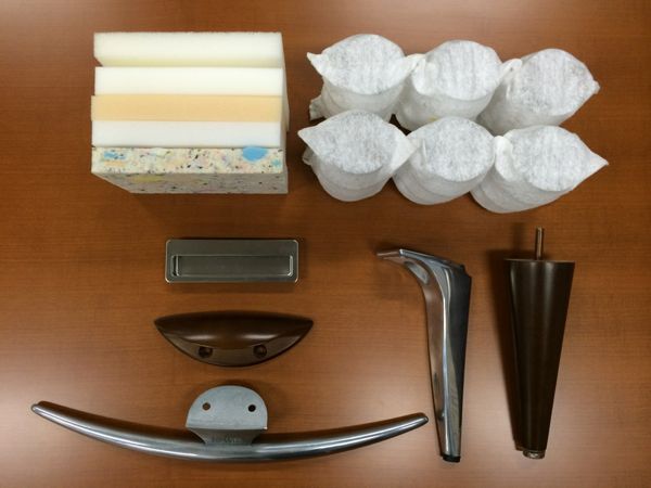 ソファによく用いられているポケットコイルスプリング、ウレタンなど言葉は皆さん耳にされた事はあるかと思いますが、実際のパーツをご覧になった事がある方は少ないのではないでしょうか?しっかりご説明させて頂くのですが、よりわかりやすくするために実際に見て触って頂く事が1番です。時にはそのパーツがソファのどの部分に、どのように組まれているかをご説明するために、座面クッションを持ち上げたり、ソファの裏を見て頂いたり、ひとつの製品を様々な角度からご案内します。製品内部のパーツ以外にも、椅子などにオプションで付けて頂けるハンドルやスワロフスキーの把手などオプションパーツもご用意してあります。