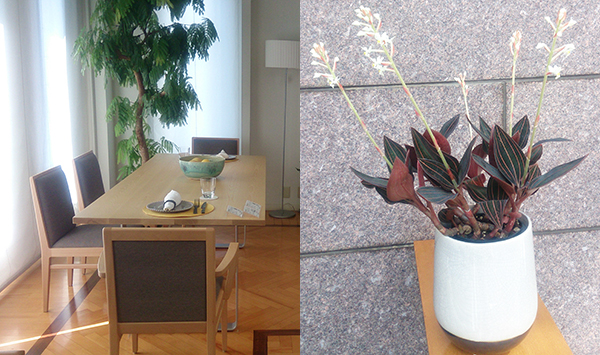 先日エーディコア・ディバイズ東京・広尾ショールームでは、春から初夏に向けイメージチェンジのディスプレイ変更をしました。今回は、マカロンのようなパステルカラーをポイントにたくさんの植物や、色とりどりのクッションや小物をディスプレイして明るく楽しい雰囲気になっています。テーブルにディスプレイした観葉植物が日に日に伸びて、ショールームの至る所に春の息吹が感じられます。その中のひとつに「ホンコンシュスラン」またの名を「ジュエルオーキッド」という植物があるのですが、ビロード状の赤葉が宝石のように輝いてみえ本当に綺麗です。葉の中央からつぼみがアスパラガスのように伸び、小さな花が咲き始めました。桜と同様、徐々に満開になるのが楽しみです。