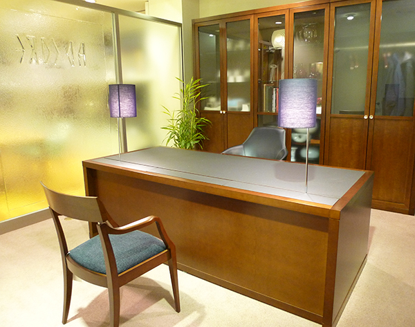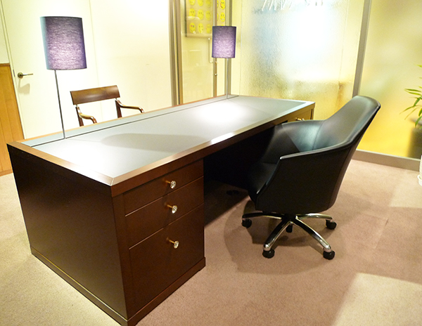 東京・広尾ショールームでは、重厚で上質感の有るネオクラシコシリーズの「エグゼクティブデスクNC-018」の展示を開始しました。デザイン性はもちろんですが、機能面もとても充実しています。天板トップには天然素材のリノリウムを用いて、抗菌性・耐久性が高くへこみや傷に強い特徴を持っています。可動式の付属スタンド照明や、LANケーブル等をスッキリ収納出来るフラップ式の収納スペース、両脇の引出しにはロック機能も備わっています。趣味の多いご主人様の書斎や、大きめのデスクをご検討の社長室にいかがでしょうか?ご満足いただけること間違い無しです。キャビネットやキャスター付きのチェアも合わせてコーディネートして頂けます。